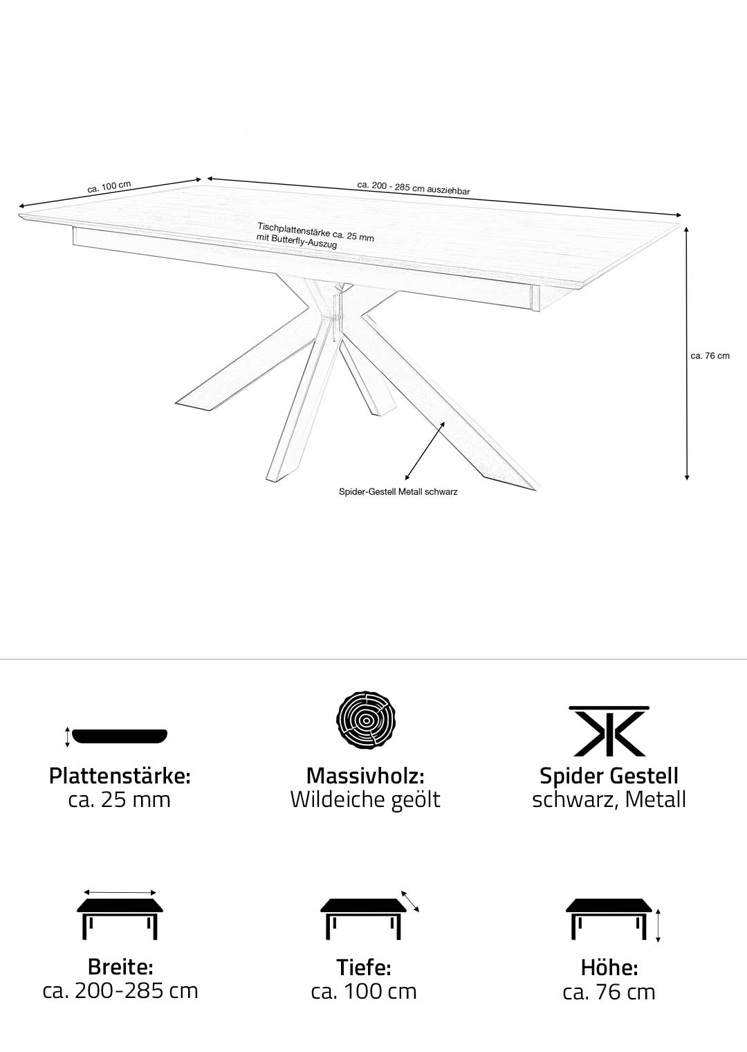 | Bestandteile | 1 Tischplatte (Butterfly-Auszug) Wildeiche Massivholz ca. 25 mm Stärke, 1 Spider-Gestell in Metall schwarz |