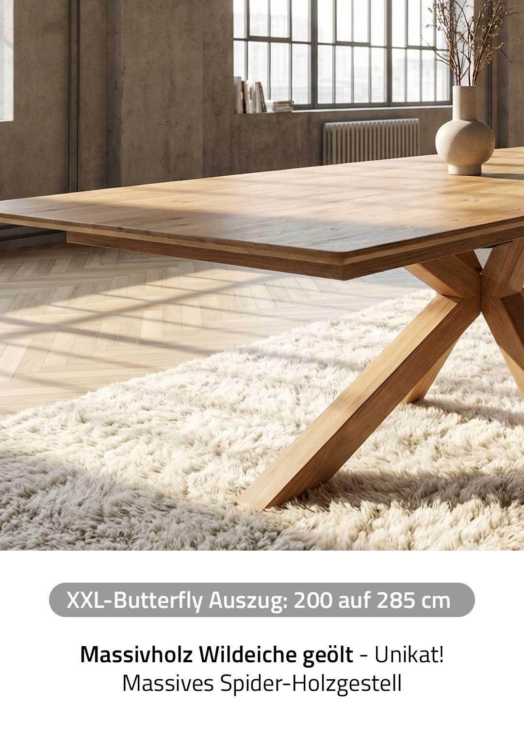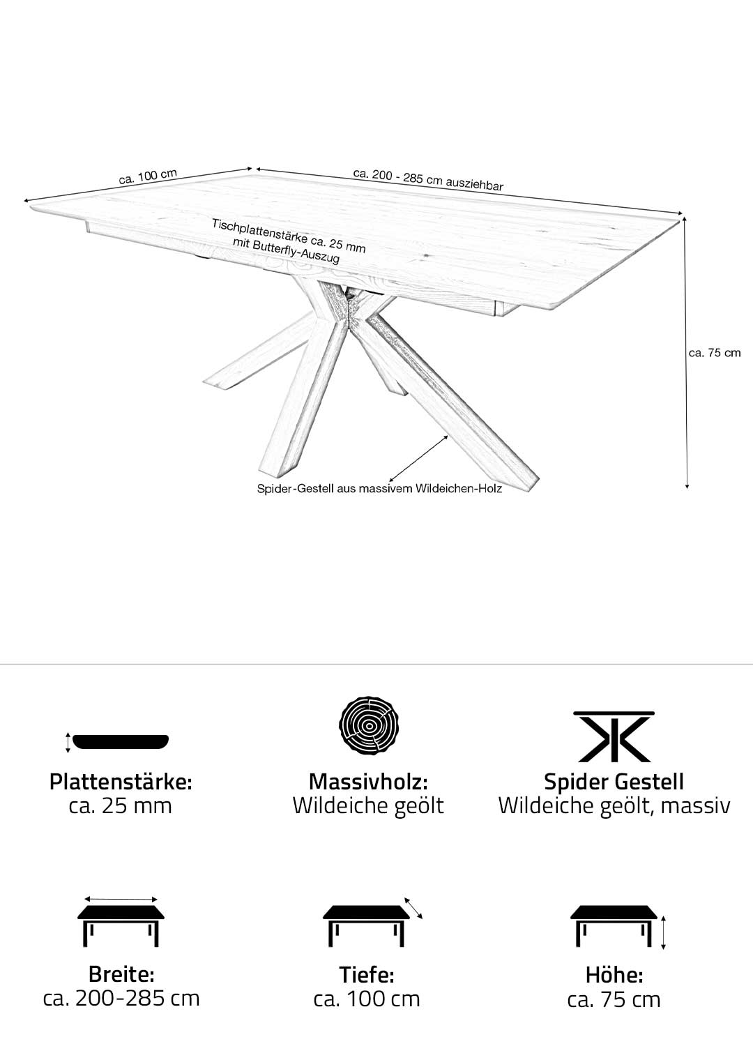 | Bestandteile | 1 Tischplatte (Butterfly-Auszug) Wildeiche Massivholz ca. 25 mm Stärke, 1 Spider-Gestell aus massiver Wildeiche geölt |