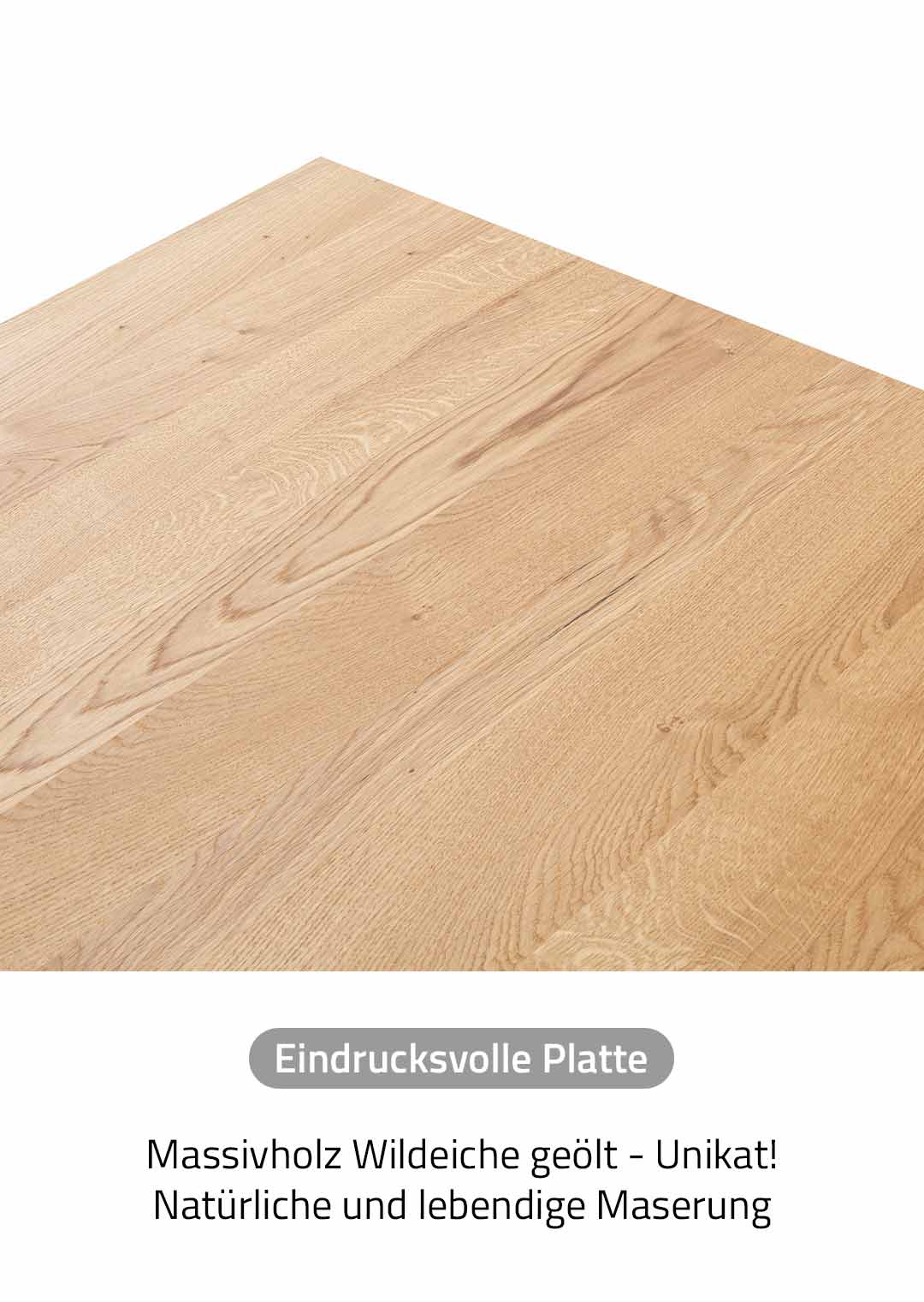 Das geölte, massive Wildeichenholz zeigt sich als besonders widerstandsfähig und wird durch intensive Farben und einer starken Maserung geprägt. Zudem ist jeder Massivholztisch in seiner Optik und Zusammensetzung ein Unikat! Durch das natürliche Wachstum, die individuelle Maserung, Verwachsungen und Farbunterschiede gleicht kein Möbelstück dem anderen. Die Holz-Maserung kann mit der Zeit je nach Lichteinstrahlung intensiver sichtbar werden und bräunlich schimmern. Massivholzmöbel sollten daher nicht direkter Sonneneinstrahlung ausgesetzt werden.