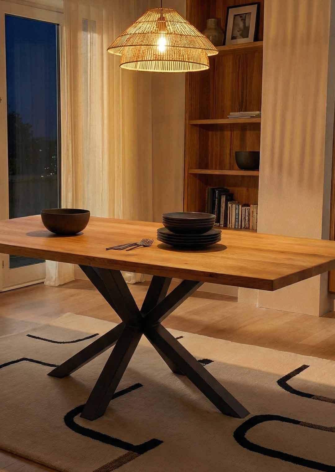 Dieser atemberaubende Massivholztisch aus geölter Wildeiche bringt die Schönheit der Natur direkt in Ihr Zuhause. Unser Esstisch verbindet pure Natur mit beeindruckendem Design und wird so zum Herzstück Ihres Esszimmers. Die massive Tischplatte beeindruckt mit ihrer einzigartigen Maserung und der lebendigen Holzstruktur. Jedes Stück erzählt seine eigene Geschichte - geformt von der Natur, veredelt durch Handwerkskunst. Den perfekten Kontrast zum warmen Holz bildet das markante Spider-Gestell aus schwarzem Metall. Es verleiht dem Tisch nicht nur eine imposante Erscheinung, sondern sorgt auch für maximale Standfestigkeit.