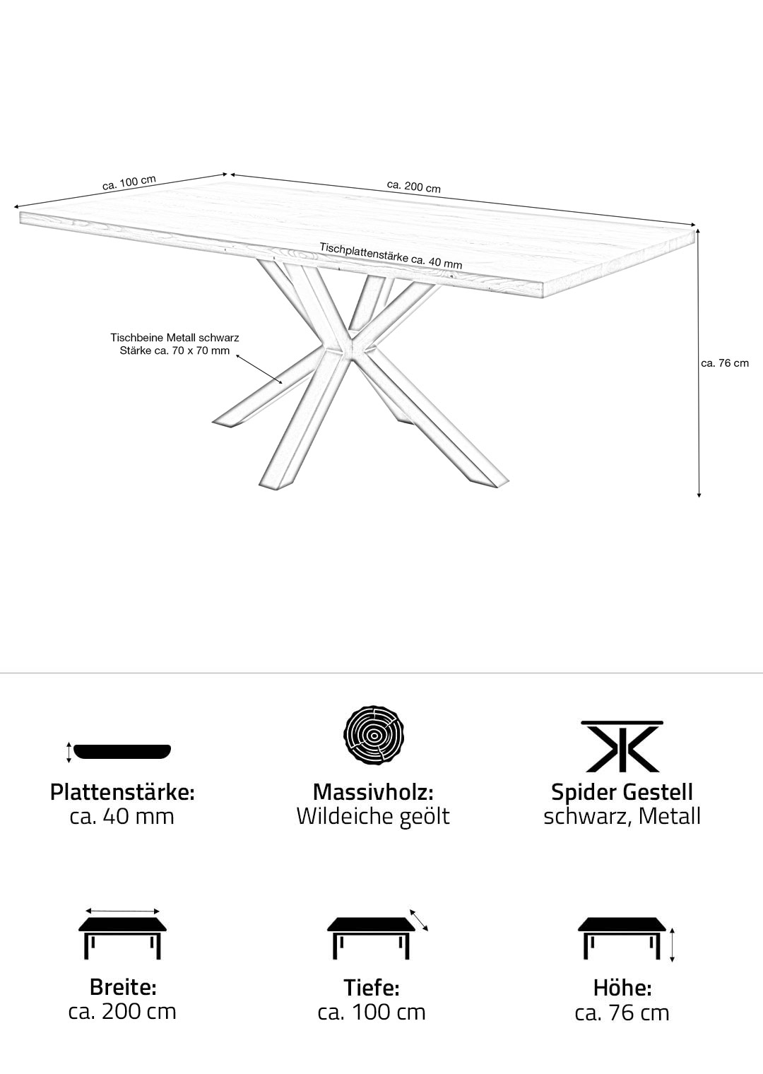 Esstisch 200 cm - Wildeiche geölt Spider-Gestell - DEBA