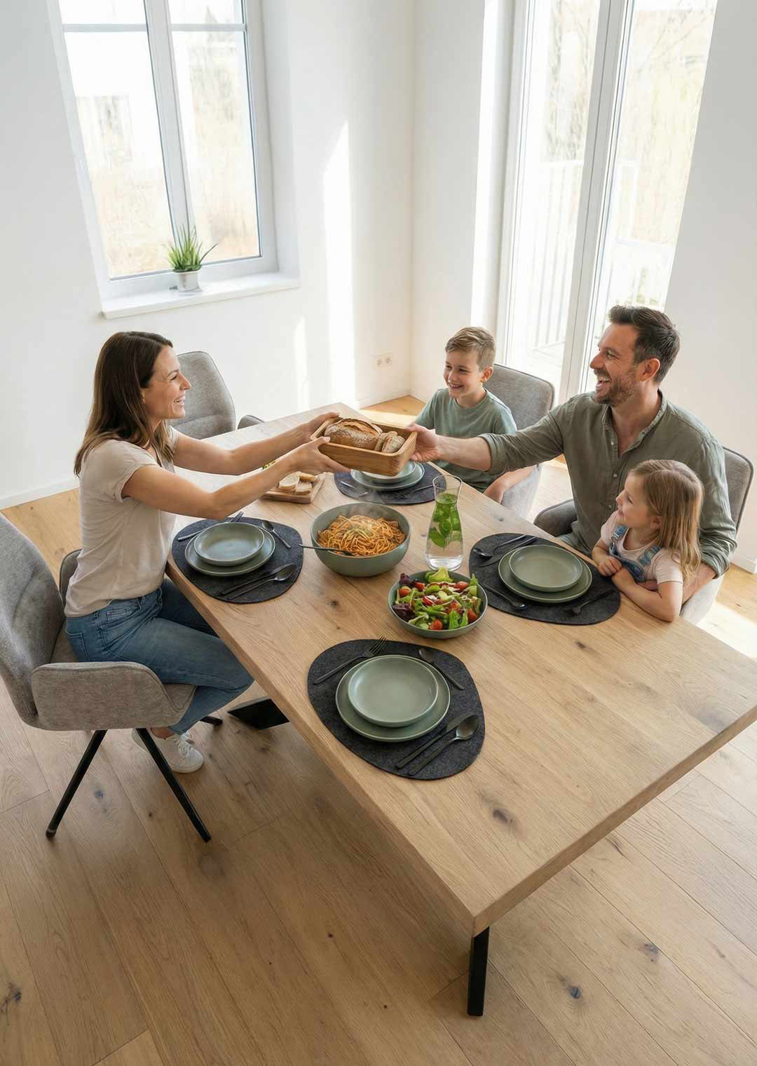 | Pflegetipps | Verwenden Sie ein weiches, leicht feuchtes Tuch, um Staub und Schmutz zu entfernen. Trocknen Sie den Tisch anschließend gründlich ab, um stehende Feuchtigkeit zu vermeiden. Nutzen Sie bei Bedarf milde, pH-neutrale Reinigungsmittel. Aggressive Reinigungsmittel oder Scheuermittel können die Oberfläche beschädigen. Wischen Sie verschüttete Flüssigkeiten umgehend auf, damit das Holz keine Feuchtigkeit aufnimmt, die Flecken oder Verformungen verursachen könnte. Um Wasserflecken oder Hitzeeinwirkungen zu vermeiden, sollten Untersetzer unter Gläsern, Tassen und heißen Tellern genutzt werden. Holz kann durch direktes Sonnenlicht ausbleichen oder Risse bekommen. Positioniere Sie den Tisch so, dass er nicht dauerhaft direktem Sonnenlicht ausgesetzt ist. Extreme Temperaturschwankungen oder trockene Heizungsluft können das Holz austrocknen oder verformen. Versuchen Sie, eine konstante Temperatur und Luftfeuchtigkeit im Raum zu halten, um Schäden zu vermeiden. Platzieren Sie Filzgleiter auf Gegenständen, die häufig auf dem Tisch bewegt werden, um Kratzer zu vermeiden. Wenn der Tisch besonders intensiv genutzt wird (z. B. bei Mahlzeiten mit vielen Personen), kann es sinnvoll sein, eine Tischdecke oder eine Schutzauflage zu verwenden, um die Oberfläche langfristig zu schonen. |