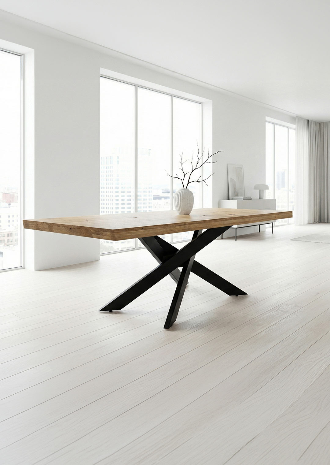 Der Esstisch AHUS vereint handwerkliche Qualität mit zeitgemäßer Formensprache und schafft so einen harmonischen Mittelpunkt für jedes Esszimmer. Die massive, geölte Wildeiche verleiht dem Tisch eine warme, natürliche Ausstrahlung, während die Schweizer Kante - eine elegant abgeschrägte Formgebung der Tischplatte - für Leichtigkeit und eine dynamische Silhouette sorgt. Die markante insgesamt ca. 60 mm starke Tischplatte hat eine durchgehende Plattenstärke von ca. 20 mm und einen zusätzlichen aufgedoppelten Rahmen von ca. 40 mm. Das schwarze Mikado-Gestell aus pulverbeschichtetem Metall bildet dazu einen spannenden Kontrast. Die Tischbeine kreuzen sich in der Mitte zu einem filigranen, spannenden Design mit dynamischer Optik, die den Tisch leichter wirken lässt und gleichzeitig Stabilität bietet. Das Zusammenspiel von natürlichen Materialien und modernen Akzenten macht AHUS zu einem Esstisch, der Charakter und Stilbewusstsein ausstrahlt.