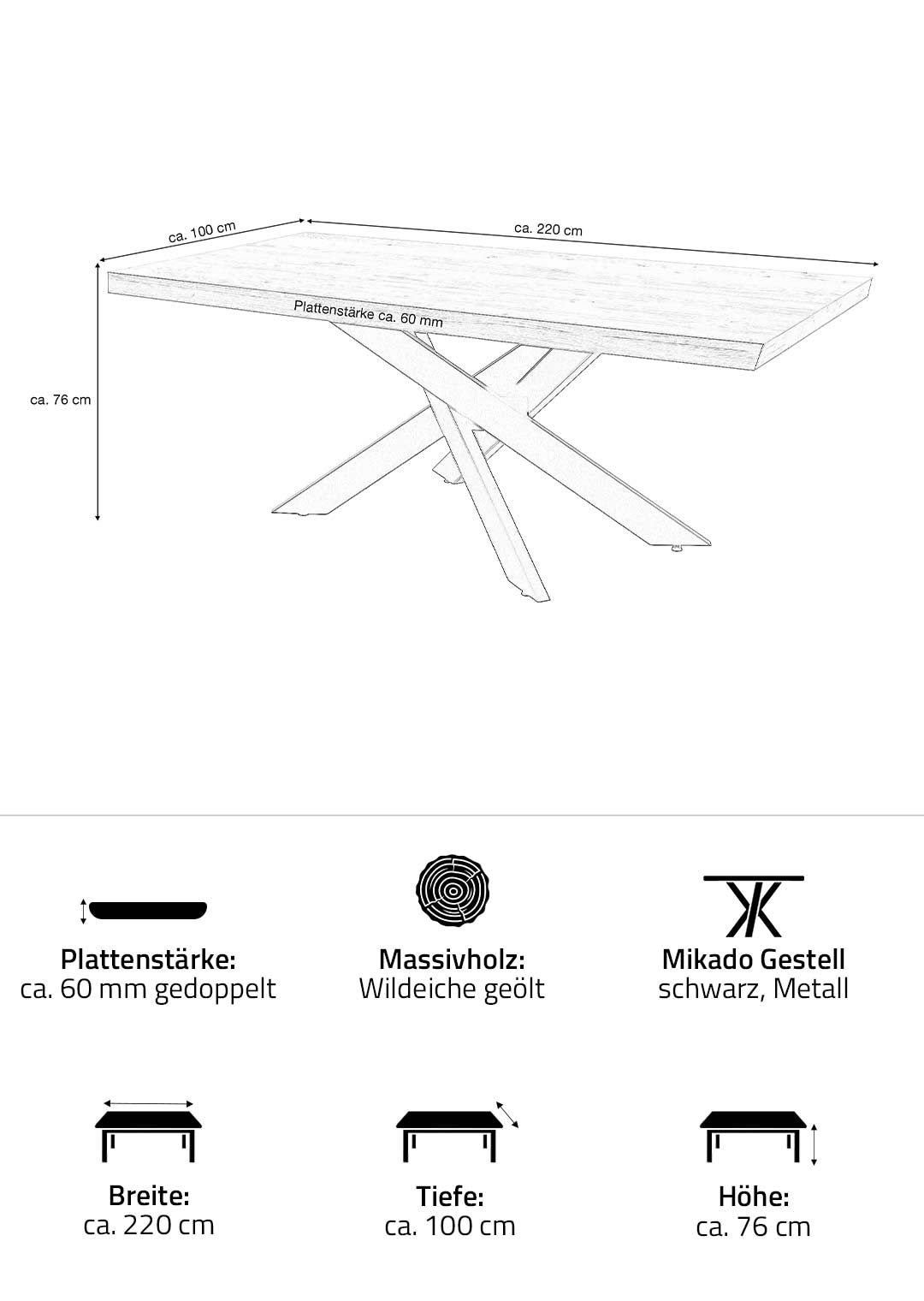 | Bestandteile | 1 x Tischplatte in Wildeiche Massivholz geölt mit Schweizer Tischkante, 1x Mikado-Gestell schwarz Metall |