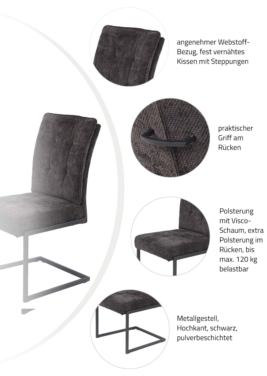 Ein Sitzgefühl der Extraklasse - unser Schwingstuhl OLENA der jeden Ort zum Lieblingsplatz macht! Der Schwingstuhl OLENA überzeugt auf den ersten Blick durch sein modernes, zugleich zeitloses Design und wird schnell zum stilvollen Blickfang in Ihrem Essbereich. Der hochwertige Webstoff in elegantem Anthrazit verleiht dem Stuhl eine edle, wohnliche Ausstrahlung und lässt sich mühelos mit unterschiedlichsten Esstischen und Einrichtungsstilen kombinieren - von modern bis industrial. Besonders die fein gearbeitete Steppung in der Rückenlehne setzt dezente Designakzente und unterstreicht die hochwertige Verarbeitung. Das filigrane, dennoch stabile Metallgestell mit schwarzer Pulverbeschichtung und markantem Hochkantprofil rundet das Gesamtbild harmonisch ab und verleiht dem Schwingstuhl eine leichte, schwebende Optik. Neben seinem ansprechenden Design begeistert der Schwingstuhl OLENA vor allem durch außergewöhnlichen Sitzkomfort und durchdachte Funktionalität. Herzstück ist der Komfortsitz mit hochwertiger Viscoschaum-Polsterung, die sich optimal an den Körper anpasst und für ein angenehm weiches, zugleich stützendes Sitzgefühl sorgt. Der Viscoschaum entlastet gezielt Rücken und Sitzfläche, speichert die Körperwärme und kehrt nach dem Aufstehen stets in seine ursprüngliche Form zurück - ideal für lange Abende am Esstisch. Die großzügige XXL-Sitzfläche bietet dabei besonders viel Platz und Bequemlichkeit. Dank der integrierten Schwingfunktion passt sich der Stuhl Ihren Bewegungen sanft an, fördert eine entspannte Sitzhaltung und erhöht den Komfort spürbar bei längeren Sitzphasen. Ein praktischer Griff im Rücken erleichtert zudem das Verrücken des Stuhls im Alltag. Der Schwingstuhl OLENA vereint ergonomischen Komfort, langlebige Materialien und stilvolles Design und ist damit die perfekte Wahl für alle, die in ihrem Essbereich nicht auf Bequemlichkeit und Qualität verzichten möchten. Bestellen Sie jetzt Ihren neuen Schwingstuhl direkt online oder rufen Sie uns gerne an.Wir freuen uns auf Sie!Produktdetails: |