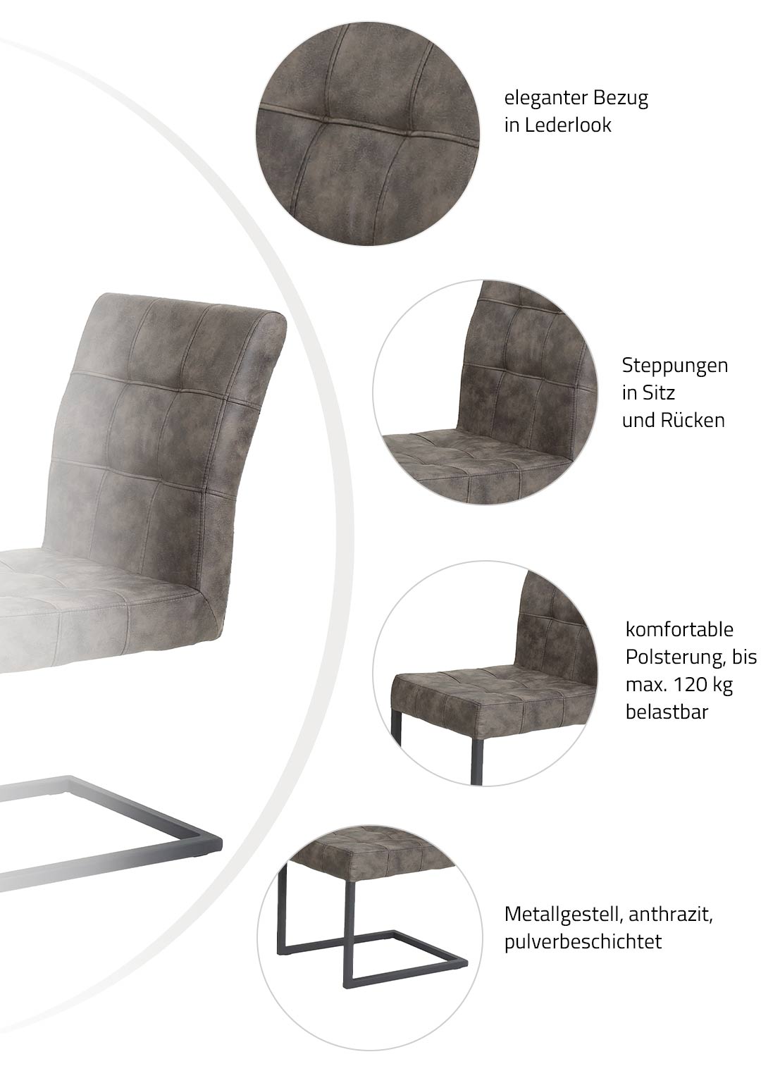 Moderner Schwingstuhl im angesagten Look - Eine optimale Ergänzung für Ihren Wohnraum! Der trendige Schwingstuhl DONNA überzeugt auf den ersten Blick durch sein modernes Design im Lederlook in Braun. Die eleganten Steppungen verleihen dem Stuhl eine edle Note und setzen dekorative Akzente, die sich perfekt in unterschiedliche Einrichtungsstile einfügen. Das pulverbeschichtete Metallgestell in Anthrazit sorgt nicht nur für einen modernen Kontrast, sondern garantiert auch Stabilität. Die zeitlose Farbkombination aus Braun im Lederlook und anthrazitfarbenem Metallgestell lässt sich hervorragend mit vielen Einrichtungsideen im Esszimmer kombinieren - von modern bis klassisch. Dank seiner robusten Verarbeitung besitzt der Freischwinger eine Belastbarkeit von bis ca. 120 kg. Die charakteristische Freischwinger-Form ermöglicht ein angenehmes, flexibles Federn und sorgt so für zusätzlichen Sitzkomfort. Mit seiner ergonomischen Sitzform und angenehmen Rückenhöhe bietet der Schwingstuhl DONNA optimalen Halt für Rücken und verschiedene Körperzonen. So genießen Sie entspannte Stunden mit Ihrer Familie oder Gästen am Esstisch. Bestellen Sie noch heute online Ihren neuen Schwingstuhl oder besuchen Sie uns in einer unserer Filialen. Wir freuen uns auf Ihren Besuch!