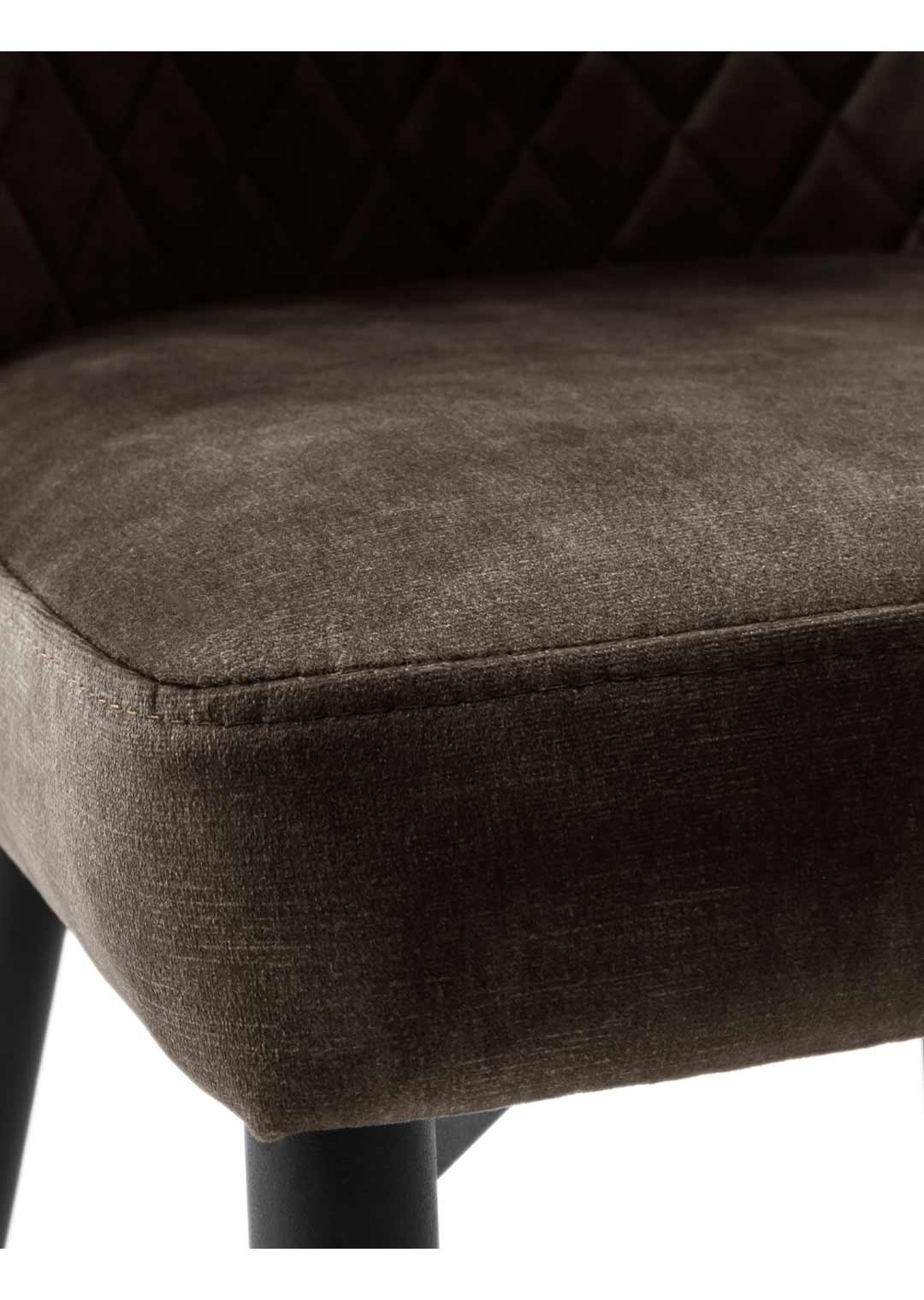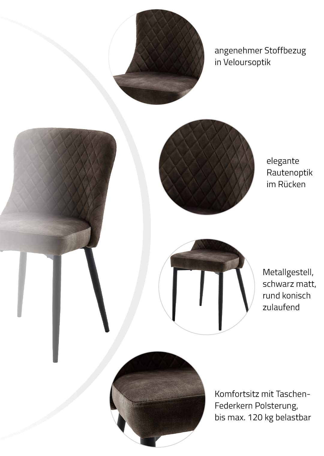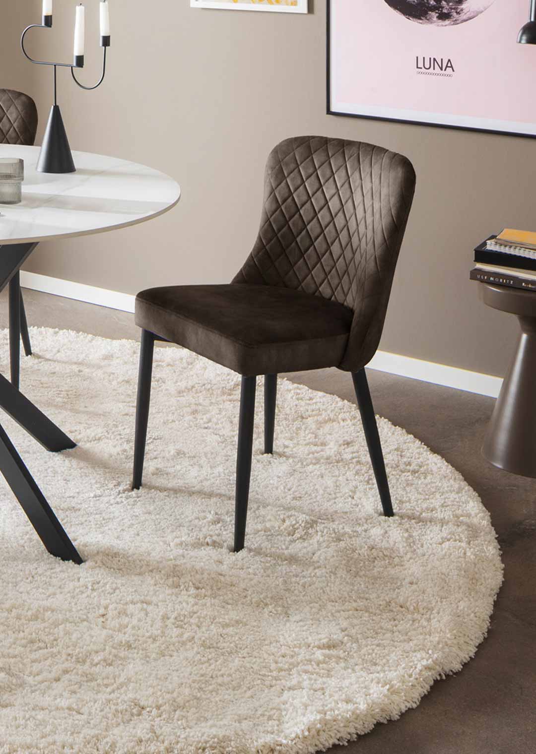 Der Polsterstuhl ABOSHI setzt durch seine Erscheinung stilvolle Akzente in jedem Esszimmer. Der Stoffbezug in edler Vintage Veloursoptik in der Farbe Anthrazit hat eine samtweiche Oberfläche, die sich nicht nur angenehm anfühlt, sondern auch durch einen leicht schimmernden Effekt beeindruckt. Auf dem Rücken verleihen Steppnähte in auffallender Rautenoptik dem Polsterstuhl ABOSHI eine gewisse Raffinesse. Das Metallgestell in matt schwarz rundet das Gesamtbild des Esszimmerstuhls perfekt ab und bietet nicht nur Stabilität im Alltag, sondern verleiht dem Stuhl mit der runden, konisch zulaufenden Form auch eine elegante Leichtigkeit.