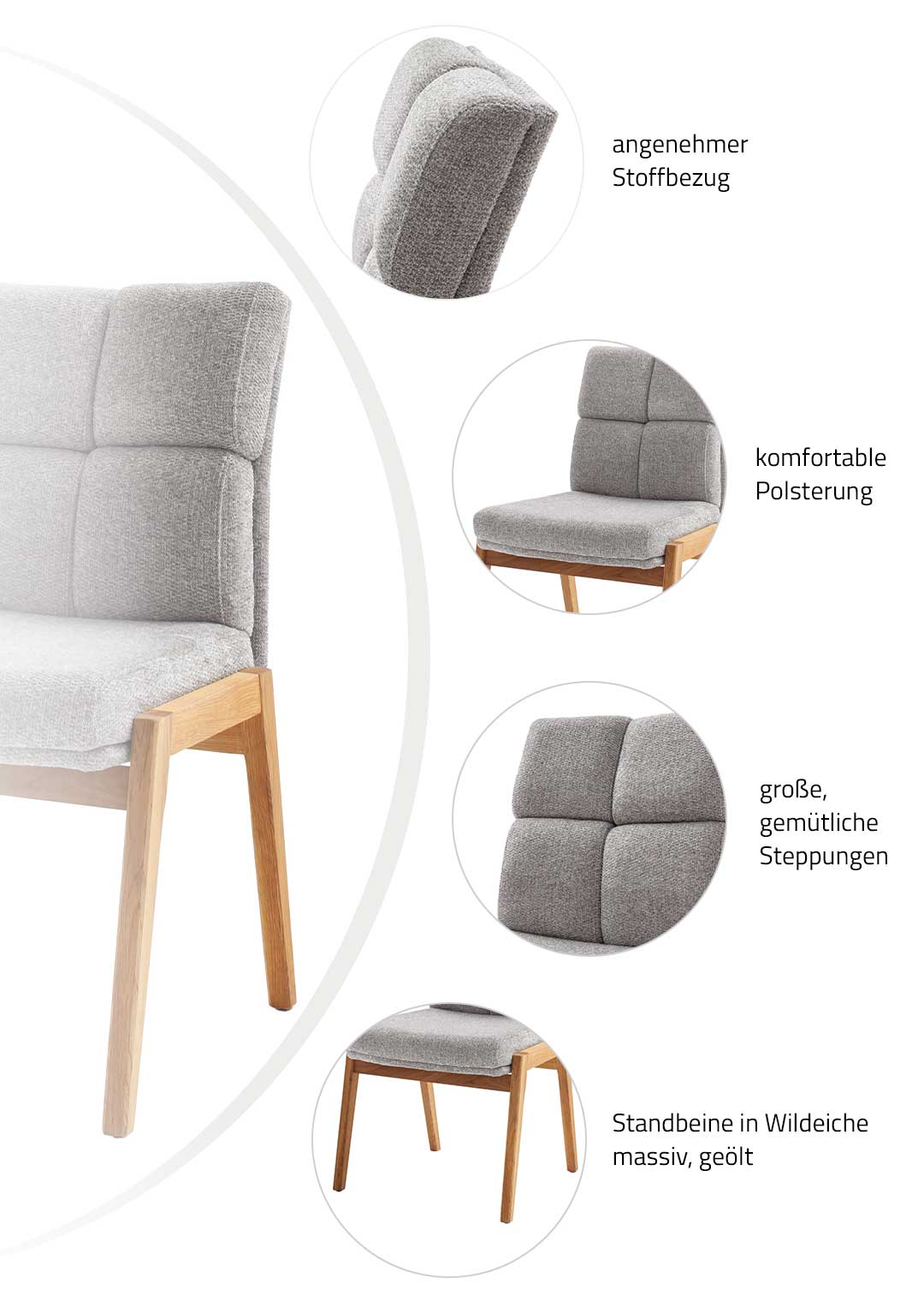 Polsterstuhl in grau mit Standbeinen in Wildeiche - LAUREN
