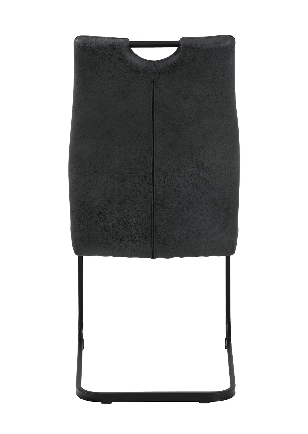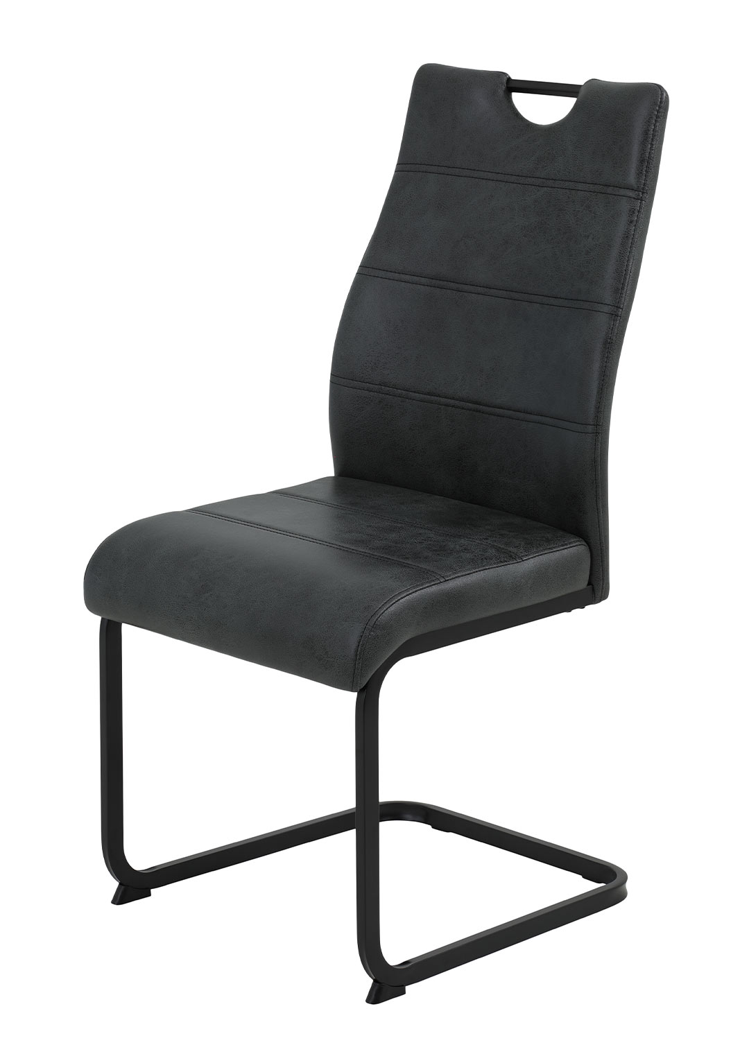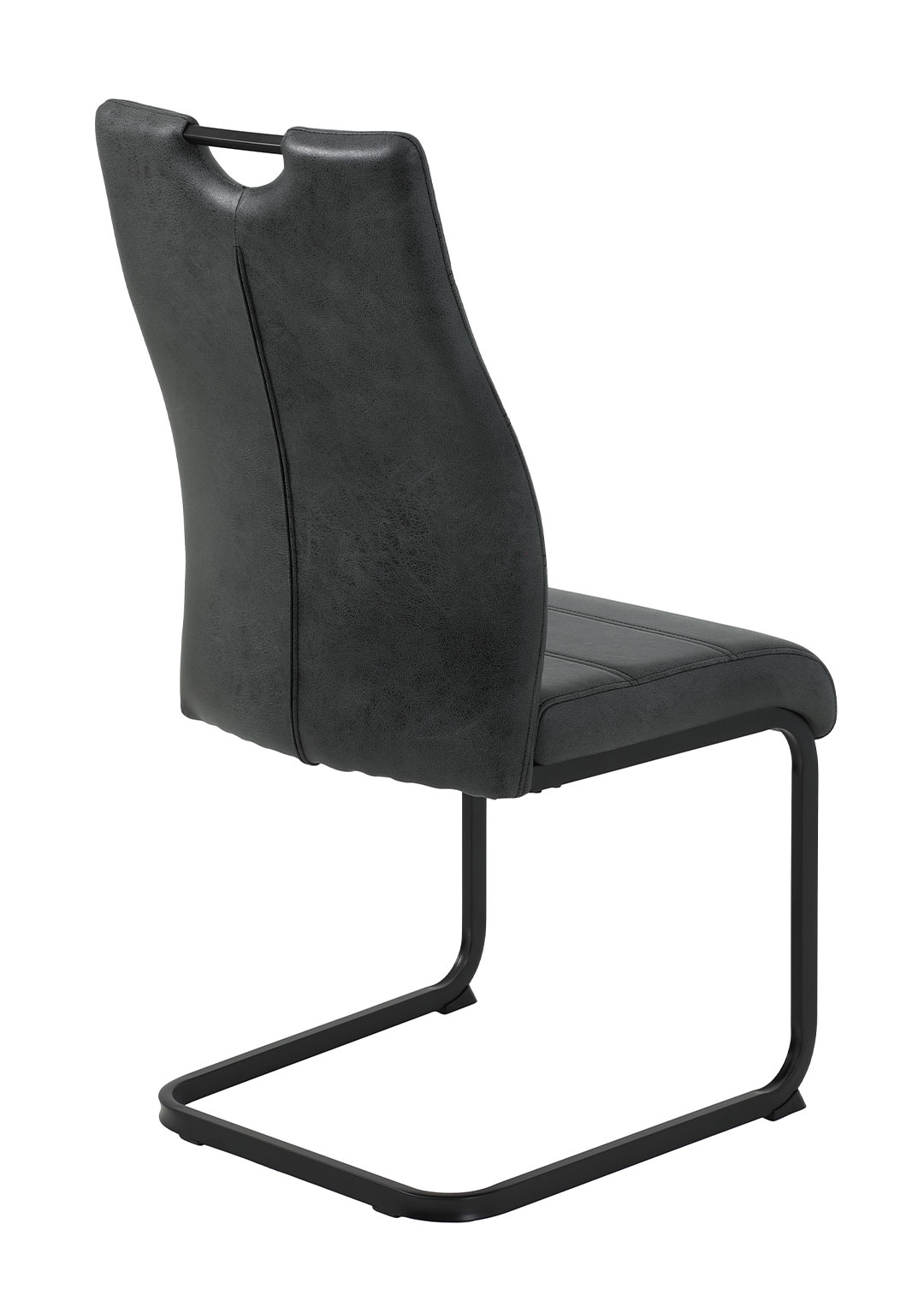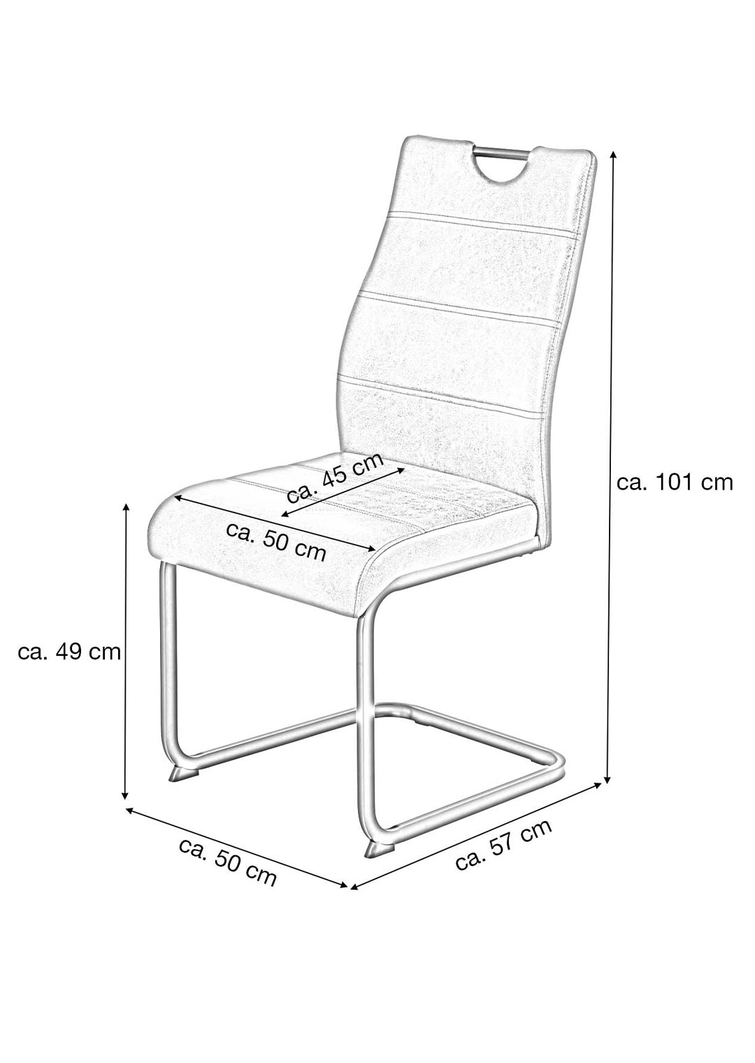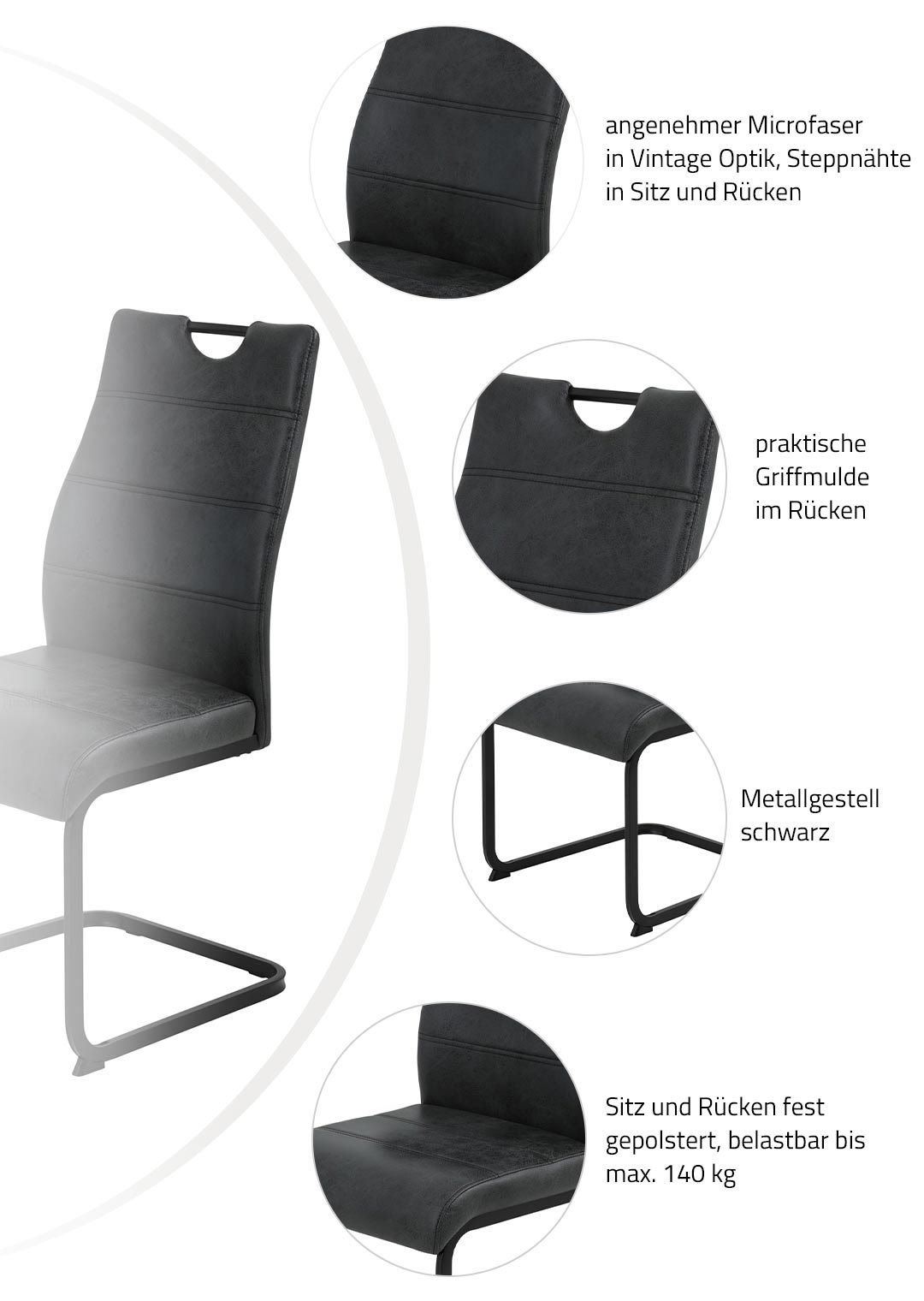Schwingstuhl in einem aktuellen Vintage Design - Eine individuelle Ergänzung für Ihren Wohnraum! Der trendige Schwingstuhl MELINA zieht mit seinem eleganten Vintage Microfaserbezug in Anthrazit direkt alle Blicke auf sich. Genießen Sie entspannte Momente mit Ihren Freunden und der ganzen Familie an Ihrem Esszimmertisch. Die angebotene Farbwahl lässt sich vielfältig kombinieren, wodurch Sie den Esszimmerstuhl problemlos in Ihre bestehende Einrichtung integrieren können. Das Erscheinungsbild wird stilsicher ergänzt durch das schwarze pulverbeschichtete Metallgestell. Dieses Gestell sorgt dank stabiler Verarbeitung für eine max. Belastbarkeit des Stuhles von ca. 140 kg. Dank der Freischwinger-Form erwartet Sie ein flexibles Federn in der Sitzposition. Am oberen Ende der Rückenlehne befindet sich zudem eine praktische Griffmulde für eine einfache Handhabung des Esszimmerstuhls. Die angenehme Rückenhöhe des Schwingstuhls sowie die ergonomische Form, fördern eine entspannte Sitzposition Ihrer Körperregionen. Bestellen Sie noch heute online Ihren neuen Schwingstuhl oder besuchen Sie uns direkt in einer unserer Filialen. Wir freuen uns auf Ihren Besuch.