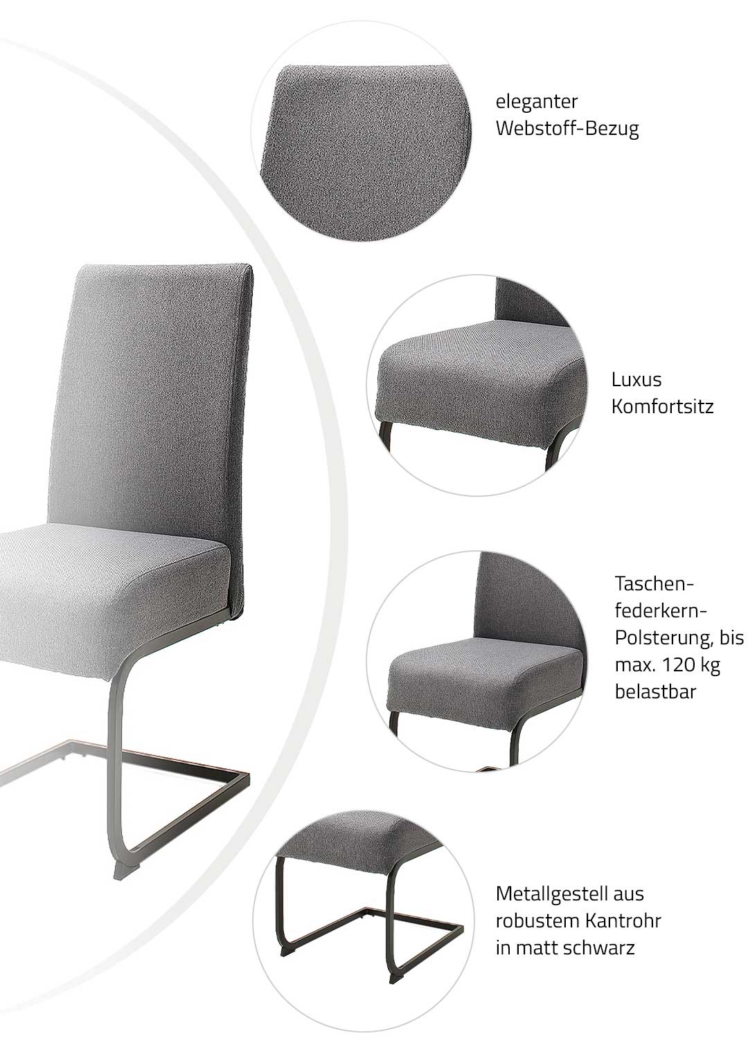 Formschöner Schwingstuhl - Die optimale Ergänzung für Ihren Wohnraum! Der Schwingstuhl ESTELI vereint modernes Design und hohen Sitzkomfort in einem Möbelstück. Mit seinem eleganten Bezug aus Webstoff in Anthrazit passt er perfekt in jedes Esszimmer und harmoniert sowohl mit modernen als auch mit klassischen Einrichtungen. Die dezente Farbgestaltung macht ihn vielseitig kombinierbar und zu einer stilvollen Ergänzung für Ihr Zuhause. Besonders ins Auge sticht ist das Gestell aus robustem Kantrohr in schwarz matt, das dem Stuhl nicht nur Stabilität, sondern auch eine klare, zeitlose Formensprache verleiht. Durch die solide Verarbeitung bietet der Freischwinger eine Belastbarkeit von bis zu ca. 120 kg und eignet sich somit ideal für den täglichen Gebrauch. Ein weiterer Pluspunkt ist die Polsterung mit Taschenfederkernkomfortsitz, die für ein angenehm weiches, zugleich stützendes Sitzgefühl sorgt. In Kombination mit der freischwingenden Konstruktion erleben Sie ein sanftes Nachgeben bei jeder Bewegung - perfekt für langes, entspanntes Sitzen bei gemeinsamen Mahlzeiten, Spieleabenden oder geselligen Runden mit Freunden und Familie. Mit seiner gelungenen Kombination aus edlem Webstoff, dem Metallgestell und der bequemen Polsterung wird der Schwingstuhl ESTELI zum echten Hingucker in Ihrem Esszimmer. Gleichzeitig überzeugt er durch seine Funktionalität, Vielseitigkeit und hohe Qualität. Bestellen Sie noch heute online Ihren neuen Schwingstuhl oder lassen Sie sich von uns beraten. Wir freuen uns auf Sie!