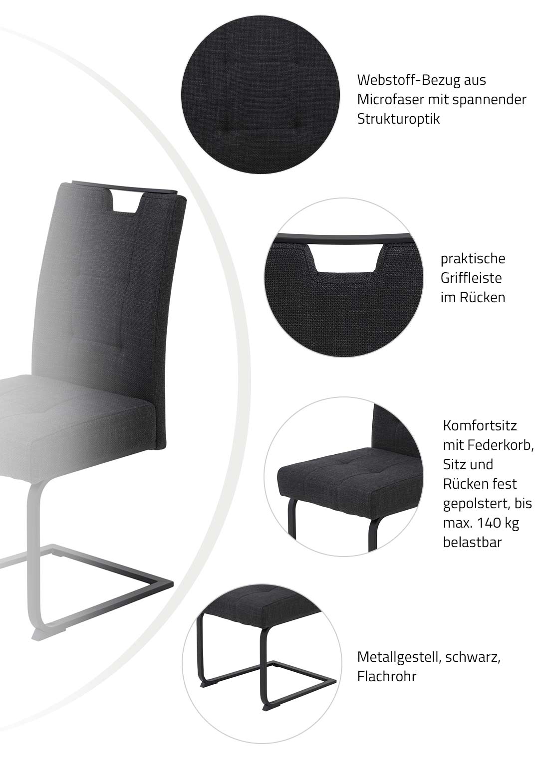 Verschönern Sie Ihr Esszimmer und erleben Sie gleichzeitig ein Sitzgefühl, dass Sie nicht mehr loslässt. Der Schwingstuhl WIEN erzeugt mit der spannenden Strukturoptik des Webstoff-Bezugs aus Microfaser und dem Farbton Anthrazit eine elegante und gleichzeitig moderne Atmosphäre im Esszimmer. Geradlinige Steppnähte in Rücken und Sitz veredeln das Design des Schwingstuhls. Ein Metallgestell in schwarz aus Flachrohr und die schwarze Griffleiste im Rücken setzen spannende Farbkontraste zum hellen Bezug. Gleichzeitig sorgt das Metallgestell für die nötige Stabilität des Stuhls bei der alltäglichen Nutzung.