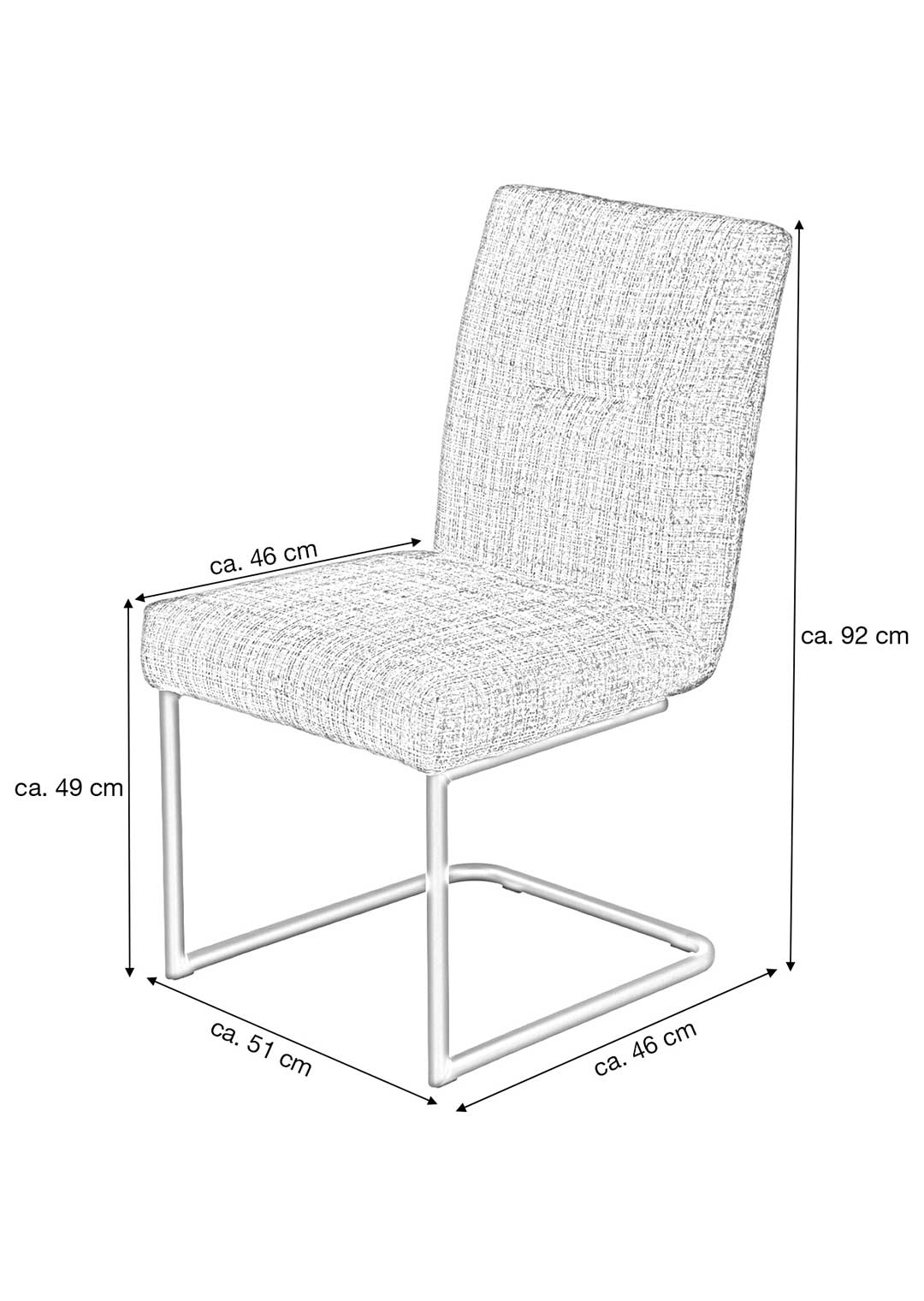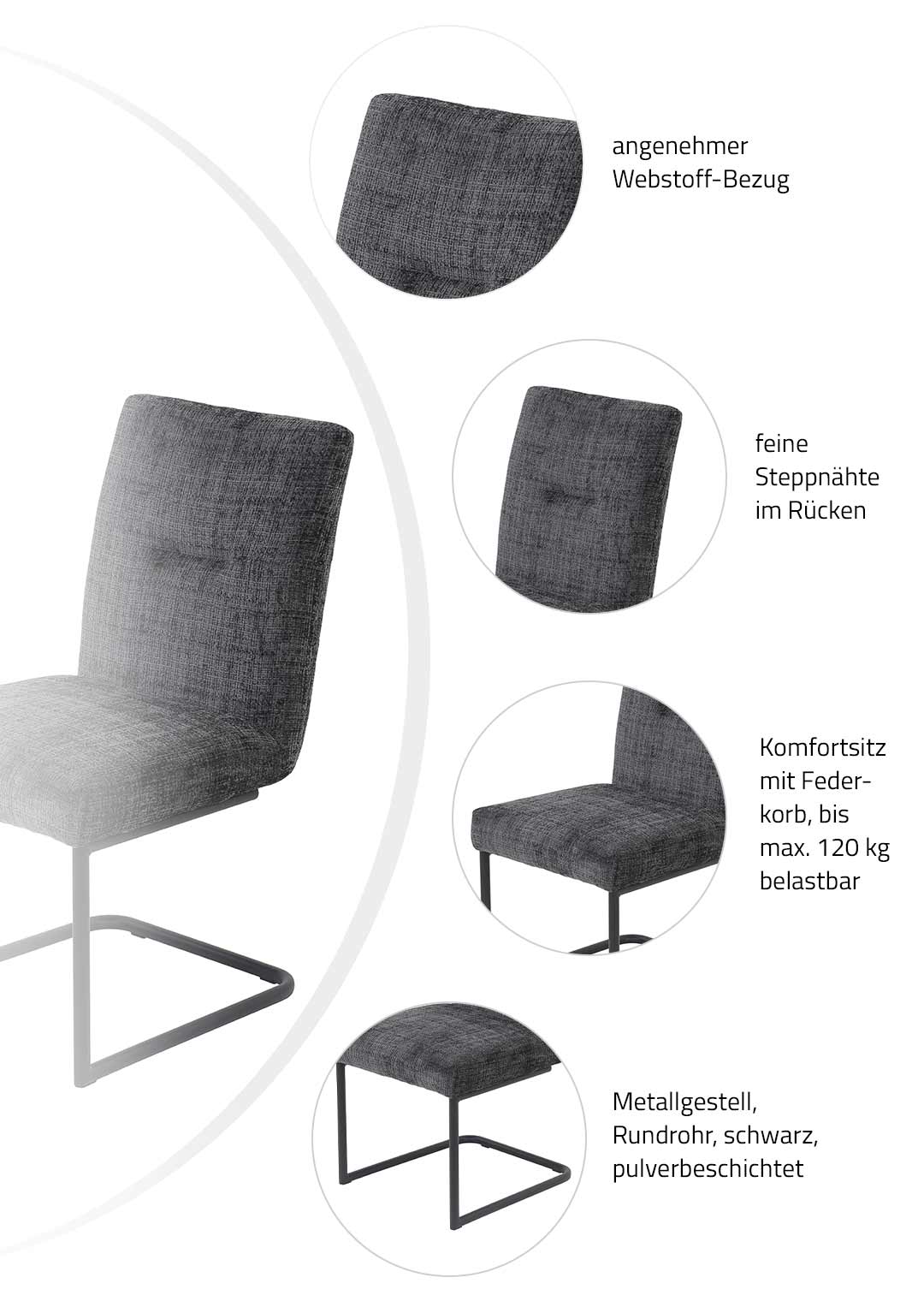 Stilvoll schweben - unser Schwingstuhl CLEO für modernes Wohnen!Mit diesem stilvollen Schwingstuhl in elegantem anthrazit verleihen Sie Ihrem Essbereich eine moderne, wohnliche Note und setzen gleichzeitig geschmackvolle Designakzente. Der Webstoffbezug in angesagter Strukturoptik überzeugt nicht nur optisch, sondern sorgt auch für eine angesagte Ausstrahlung, die den Raum sofort einladender wirken lässt. Fein platzierte Steppnähte im Rücken lockern das Gesamtbild auf dezente Weise auf und betonen die hochwertige Verarbeitung. Harmonisch ergänzt wird das Design durch das schwarze, pulverbeschichtete Rundrohr-Metallgestell, das dem Stuhl einen Hauch von Industrial-Chic verleiht und zugleich für eine stabile, langlebige Konstruktion sorgt. Die typische Schwingform des Gestells unterstützt die elegante Linienführung und verleiht dem Stuhl eine leichte, schwebende Optik. Auch in puncto Komfort weiß dieser Schwingstuhl auf ganzer Linie zu überzeugen. Die hochwertige Polsterung mit Federkorb bildet das Herzstück des angenehmen Sitzgefühls. Dabei sorgen elastisch gelagerte Stahlfedern im Sitzinneren für eine gleichmäßige Druckverteilung, optimale Unterstützung und eine dauerhaft formstabile Polsterung. Der Federkorb passt sich den Bewegungen des Körpers flexibel an, federt sanft nach und bietet spürbare Entlastung - selbst bei längeren Sitzphasen. In Kombination mit der großzügigen Sitzbreite von ca. 51 cm entsteht ein komfortabler Sitzplatz, der zum entspannten Verweilen einlädt. Ob beim ausgedehnten Dinner, beim geselligen Beisammensein mit Freunden oder im Alltag in der offenen Wohnküche - dieser Schwingstuhl fügt sich harmonisch in jede Umgebung ein und verbindet stilvolles Design mit durchdachter Funktionalität. Ein Möbelstück, das nicht nur gut aussieht, sondern Komfort und Qualität Tag für Tag erlebbar macht. Sichern Sie sich jetzt diesen stilvollen Schwingstuhl und bringen Sie Eleganz in Ihr Zuhause.Unser Team berät Sie gerne!