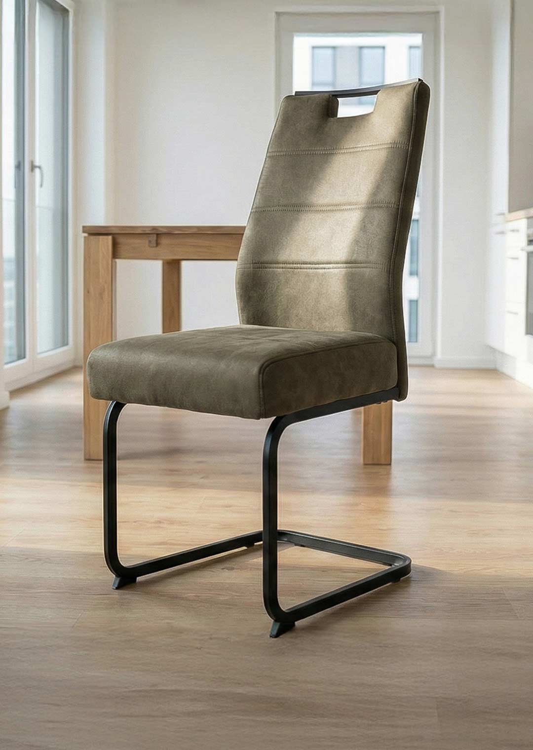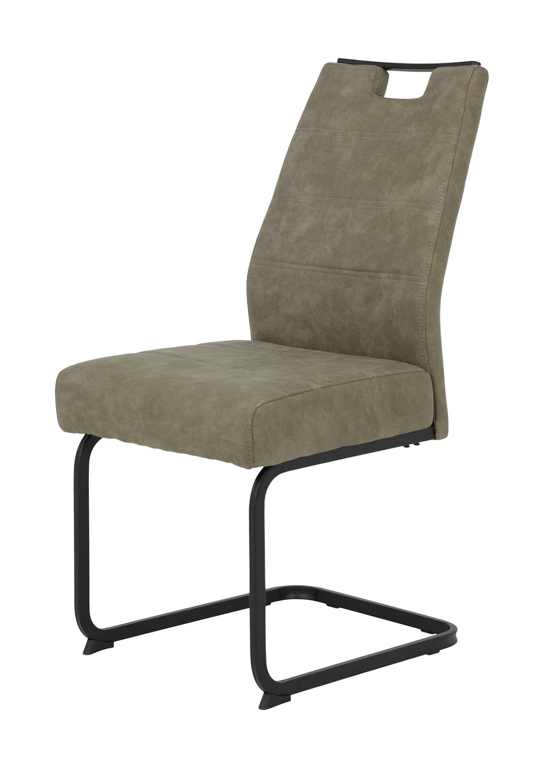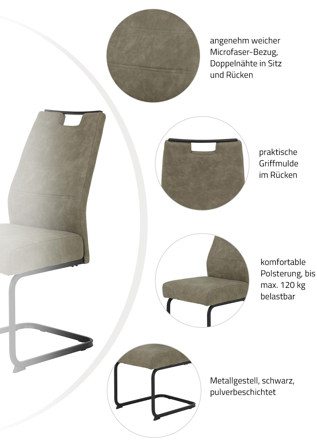 Unsere elegante Ergänzung für Ihren Essbereich!Unser Schwingstuhl KERSTIN begeistert mit seiner geschmackvollen Optik. Der schlammfarbige Microfaserbezug harmoniert perfekt mit dem schwarzen pulverbeschichteten Metallgestell - so entsteht ein stylisches Gesamtbild in Ihrem Esszimmer. Daher kann der Stuhl sowohl zu einem Massivholztisch als auch zu einem modernen Glastisch kombiniert werden. Daher ist unser Schwingstuhl vielseitig kombinierbar und stets ein edler Blickfang in Ihrer Einrichtung. Die moderne Steppung vollenden das angesagte Erscheinungsbild.Natürlich kommt der Komfort nicht zu kurz, denn dank der bequemen Polsterung genießen Sie auf dem Freischwinger beim gemeinsamen Abendessen besten Komfort. Die angenehme Polsterung sorgt auch bei längerem Sitzen für eine entspannte Haltung. Dank seiner robusten Verarbeitung bietet der Schwingstuhl hohen Sitzkomfort und eine Belastbarkeit von bis zu ca. 120 kg. Ein Griff aus schwarzem Metall an der Rückenlehne ermöglicht es Ihnen, den Stuhl unkompliziert von A nach B zu bewegen. Top modern und herrlich gemütlich. Mit unserem Schwingstuhl KERSTIN ist Ihr Esszimmer ideal ausgestattet. Bestellen Sie noch heute online Ihren neuen Schwingstuhl oder besuchen Sie uns in einer unserer Filialen. Wir freuen uns auf Ihren Besuch!Produktdetails: |
