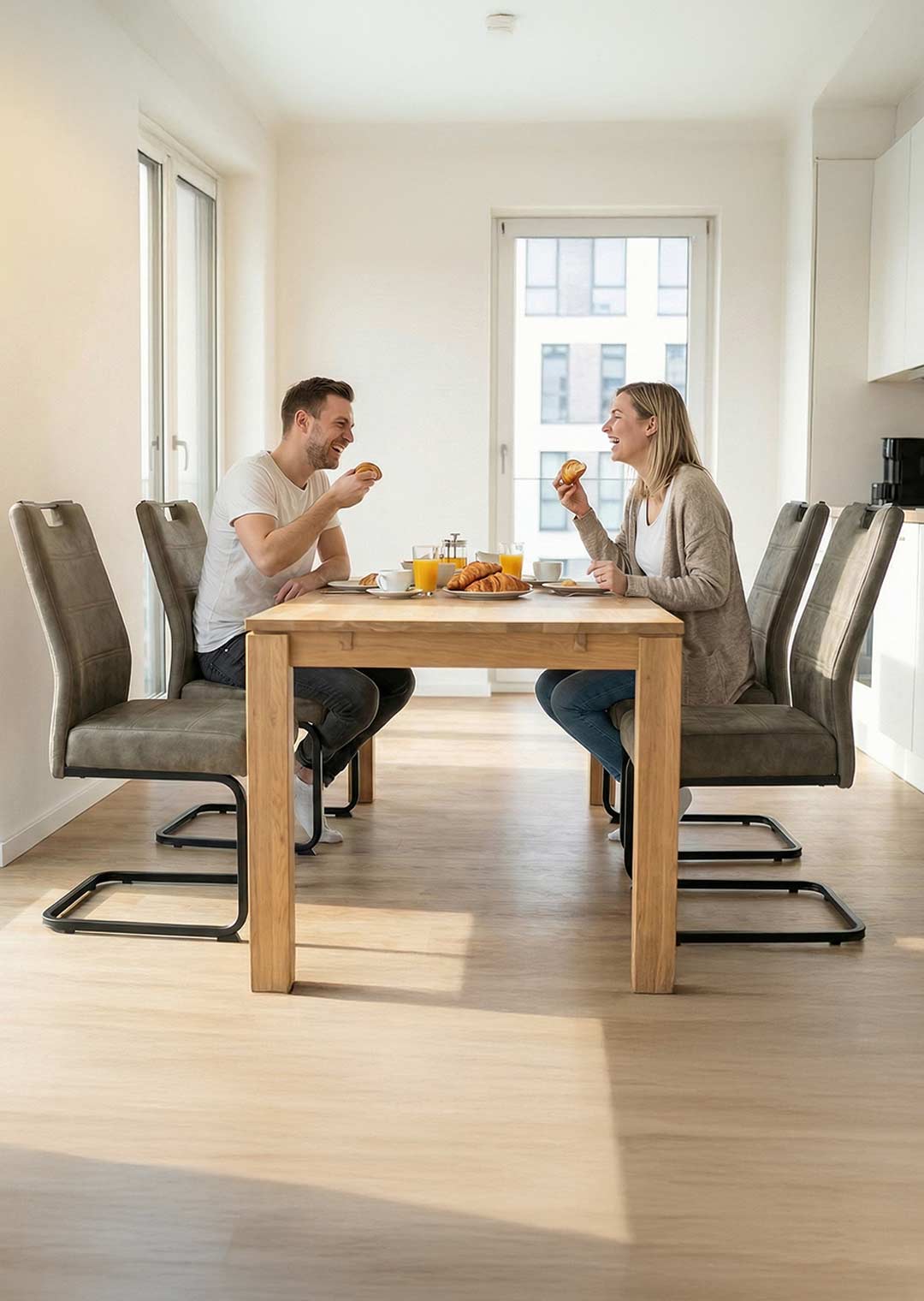 Der Stuhl spricht mich sehr an, das Metallgestell Harmoniert so gut mit dem Sitz. Ein Traum und wirklich sehr pflegelicht- dafür das es ein hellerer Stoff ist.