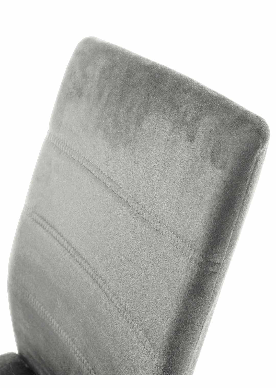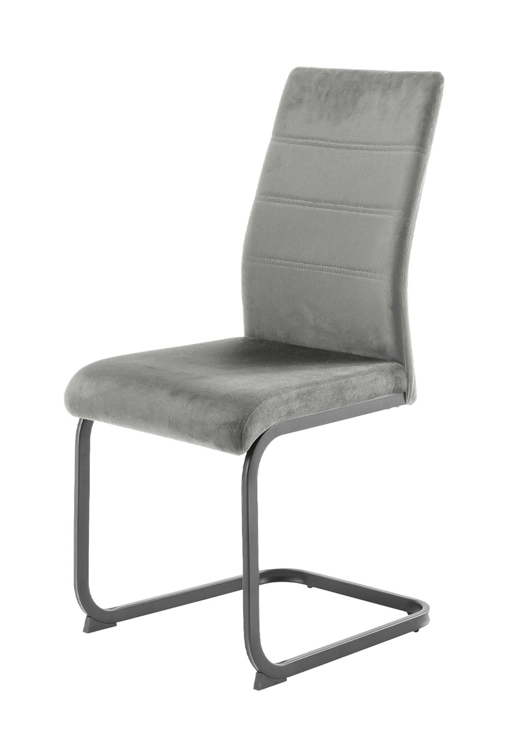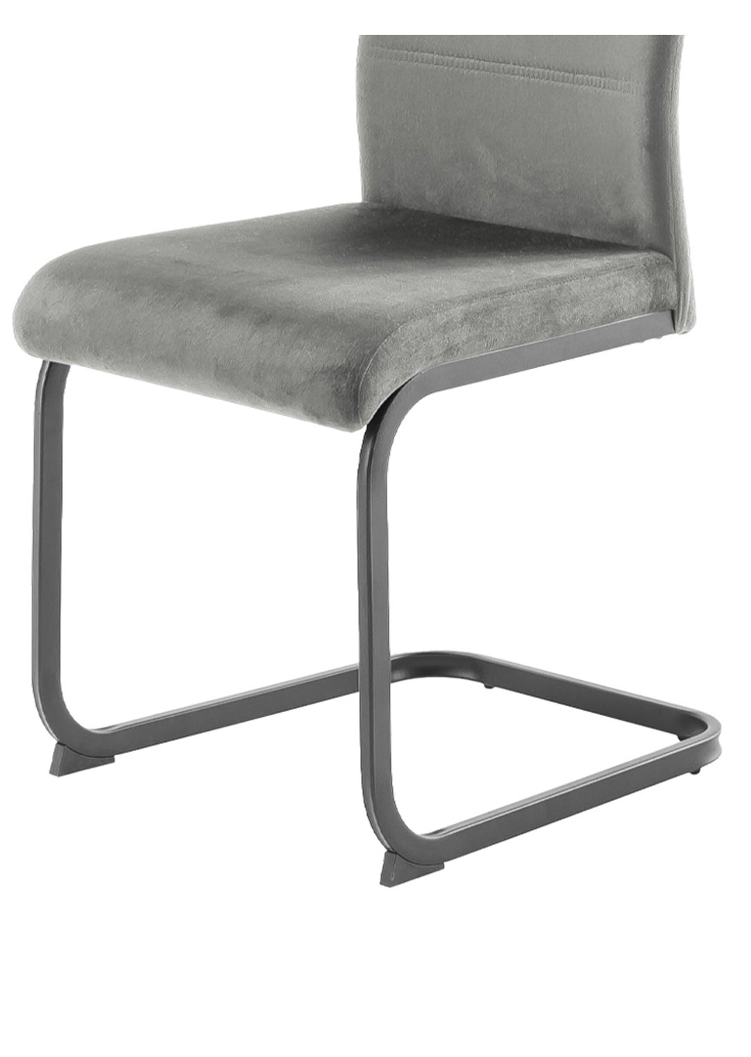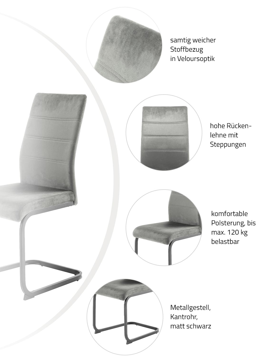 Mit seinem Bezug in Veloursoptik hat der Schwingstuhl TICINO eine samtartige, weiche Oberfläche, die sich angenehm anfühlt und gleichzeitig einen leichten schimmernden Effekt erzeugt. Hierdurch erscheint der Schwingstuhl gleichzeitig modern und edel. In hellem Grau wird die elegante Optik des Bezugs zusätzlich unterstrichen. Geradlinige Steppungen im Rücken verleihen dem Stuhl eine interessante Tiefe. Ein matt schwarzes Metallgestell fügt sich perfekt in das Design des Schwingstuhls ein und verspricht Stabilität und Standsicherheit in der täglichen Nutzung.