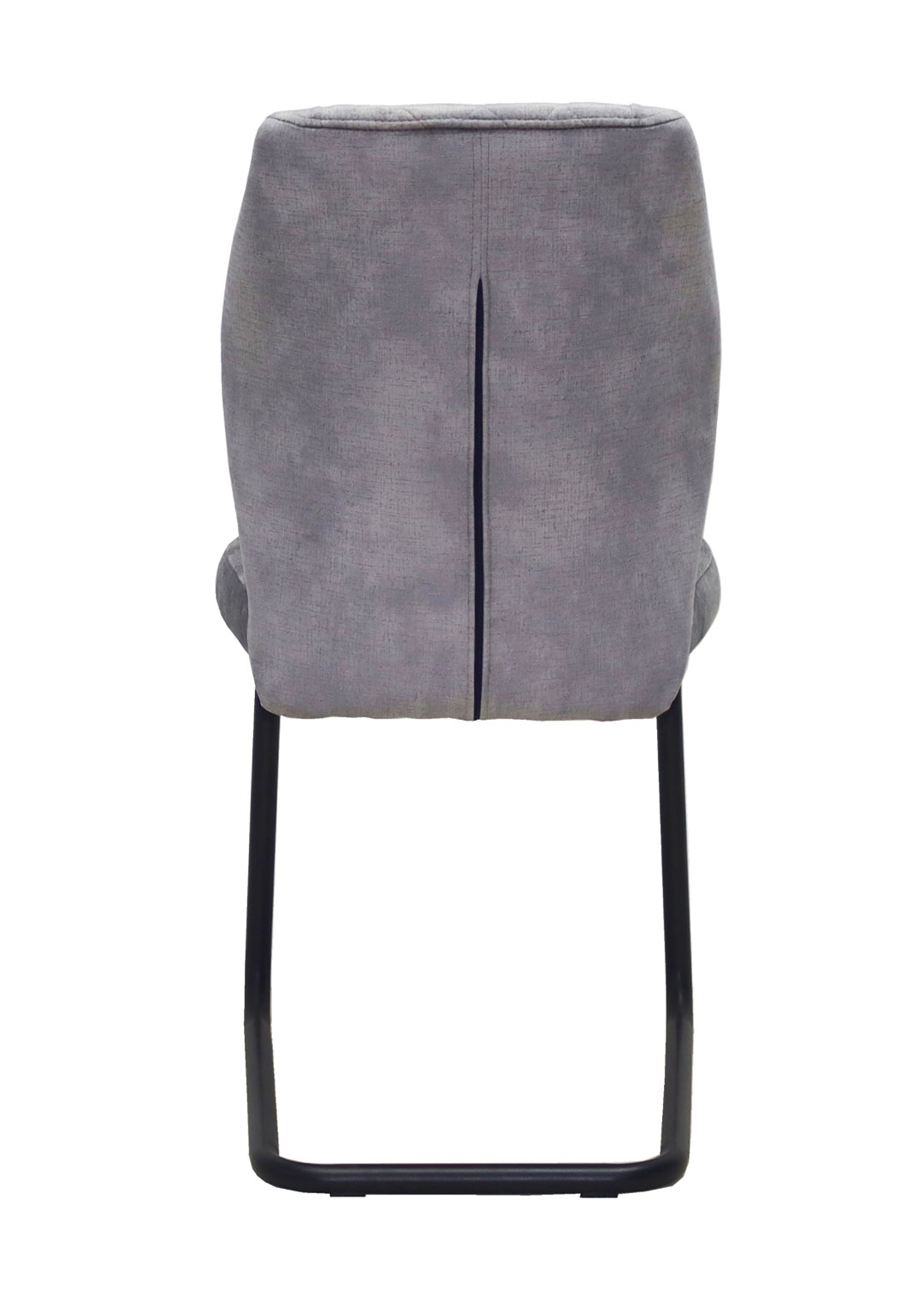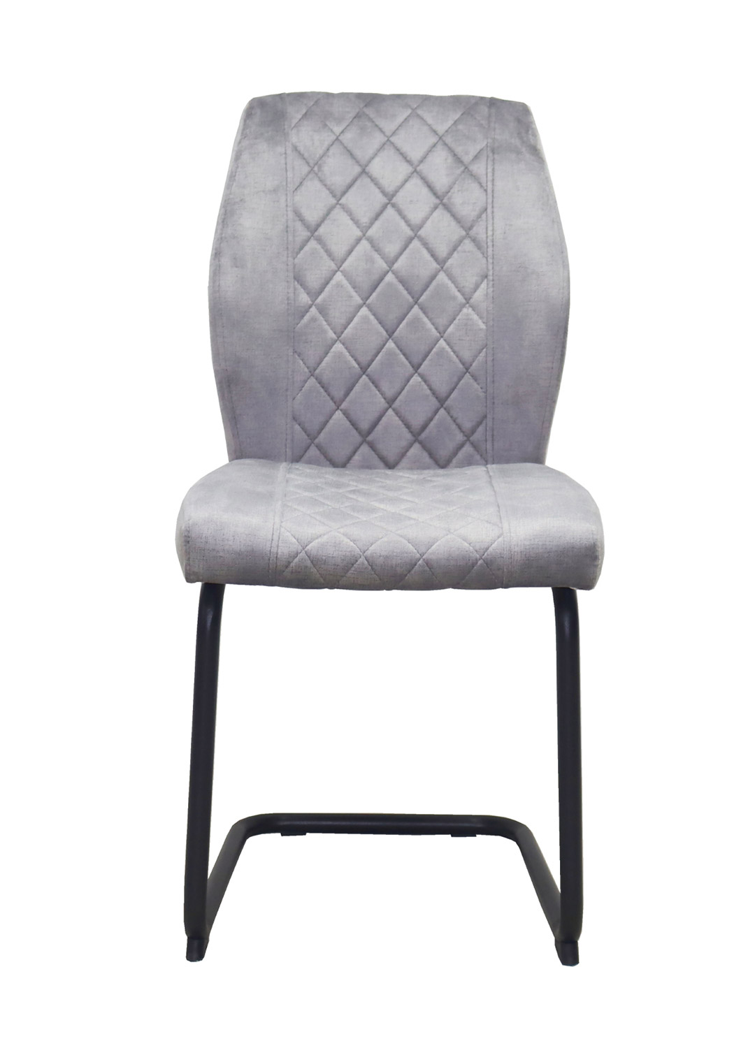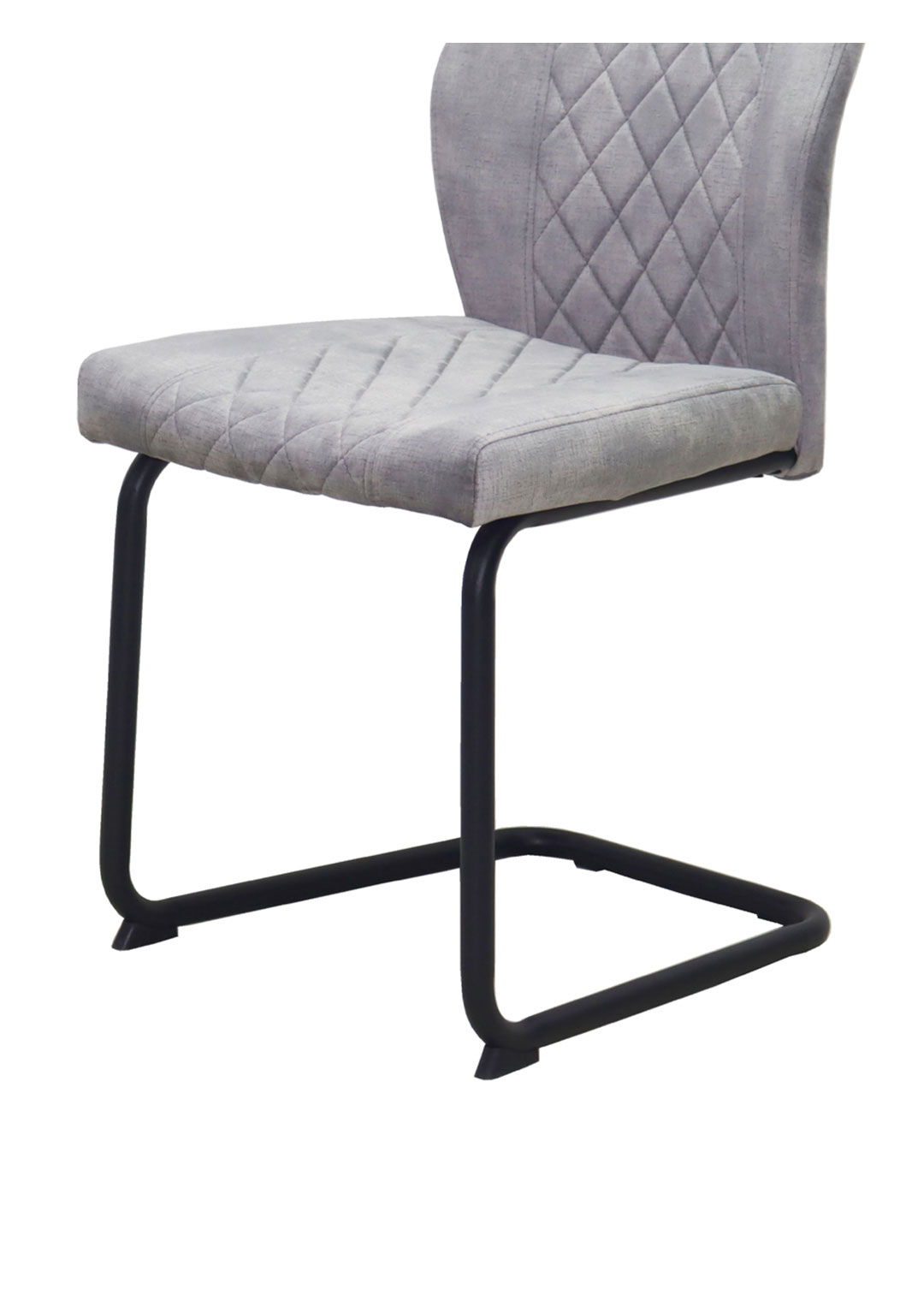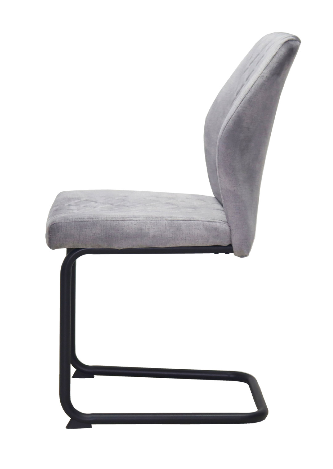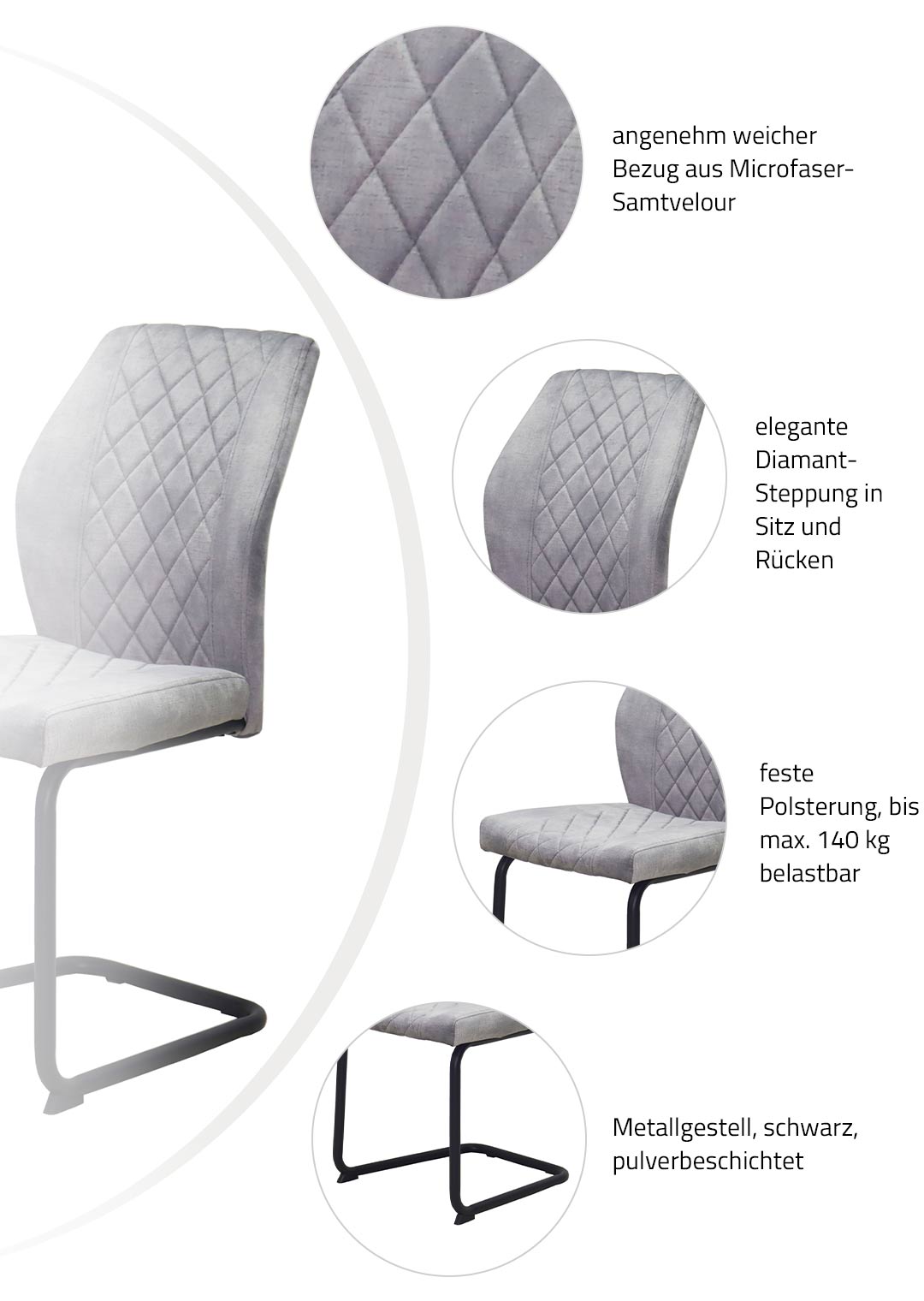 Der Schwingstuhl OLDE überzeugt in edlem Silber mit einem stilvollen Auftritt an jedem Esstisch. Sein Bezug aus Microfaser-Samtvelour fühlt sich angenehm weich und anschmiegsam auf der Haut an und zeichnet sich durch eine leicht glänzende Oberfläche aus. Die eingefasste Diamant-Steppung auf Rücken und Sitzfläche unterstreicht die elegante, fast luxuriöse Optik des Schwingstuhls. Die nötige Standsicherheit garantiert ein Metallgestell mit strukturierter schwarzer Pulverbeschichtung, welches gleichzeitig Modernität und Leichtigkeit ausstrahlt.