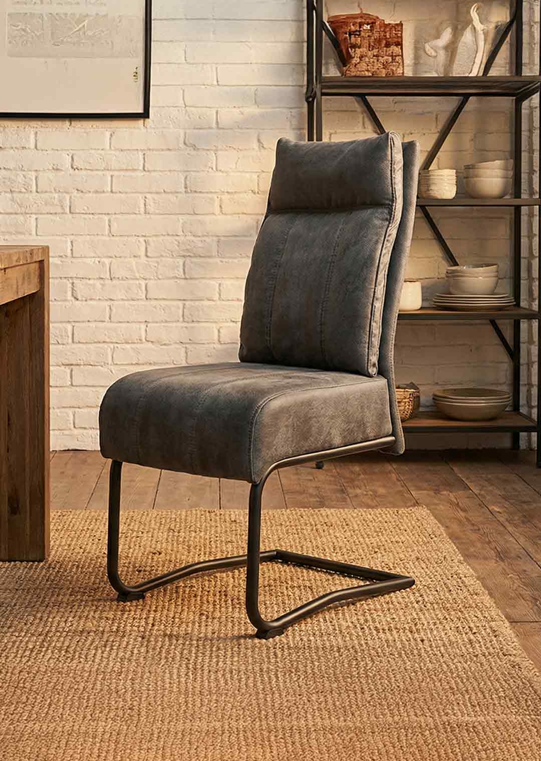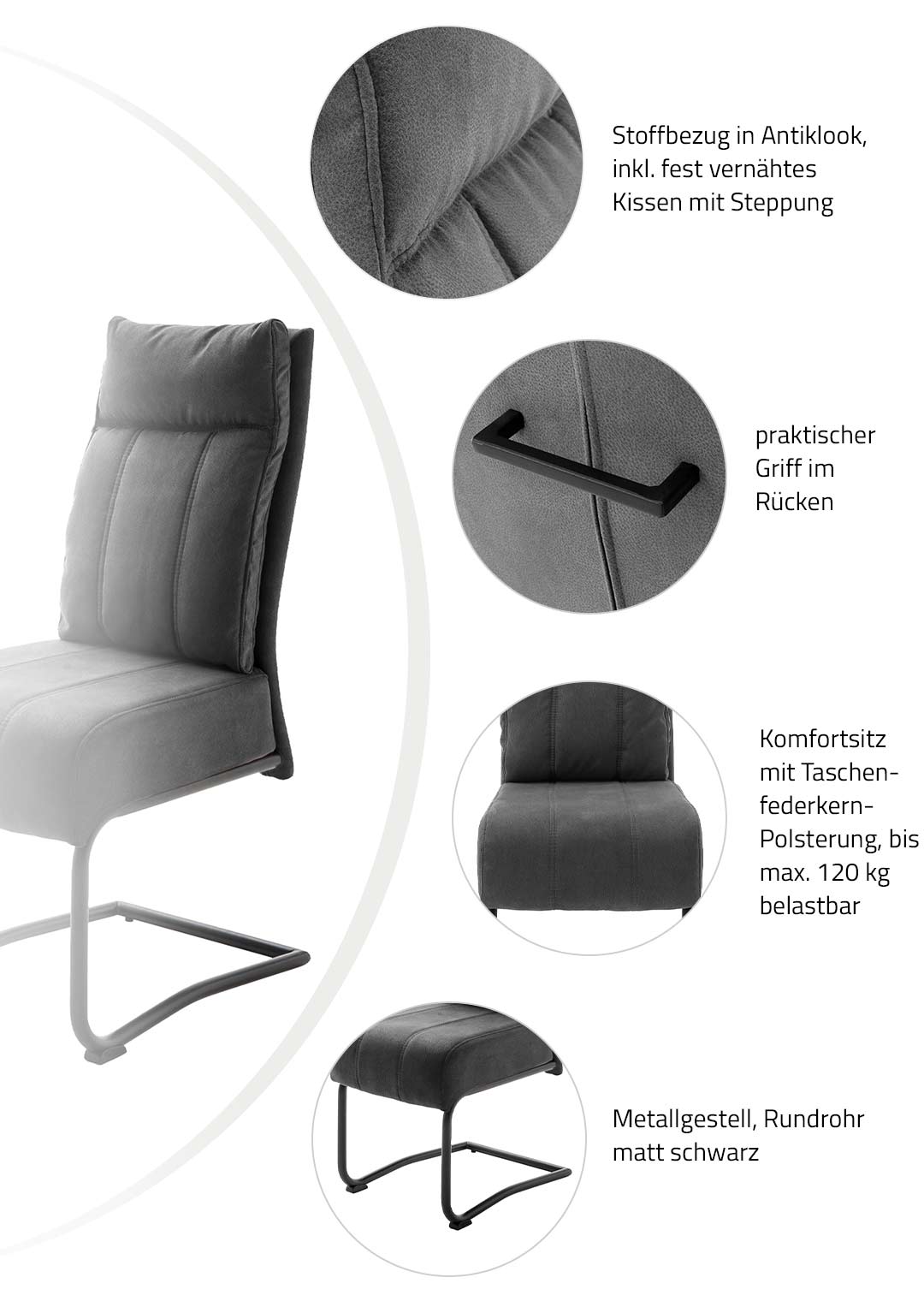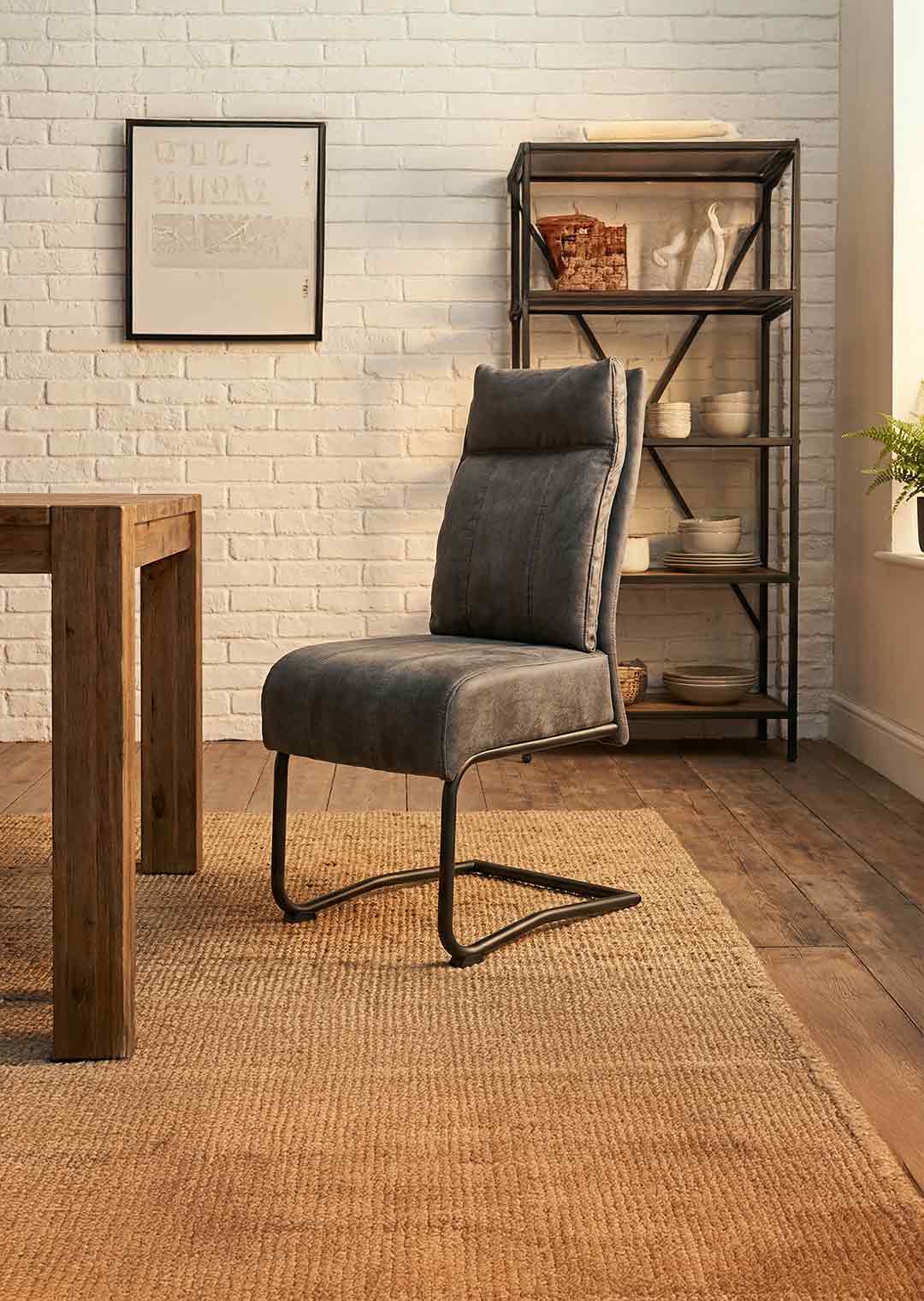 Unser Schwingstuhl AZUL erscheint mit seinem Stoffbezug in Antiklook und der großzügigen Polsterung in einer eleganten und gleichzeitig gemütlichen Optik. In dunklem Grau lässt er sich dabei problemlos mit unterschiedlichen Einrichtungsstilen kombinieren. Geradlinige Steppungen in Sitz und Rücken veredeln die äußere Erscheinung und laden zum Hinsetzen ein. Für stabilen Stand im Alltag sorgt ein matt schwarzes Metallgestell, das sich perfekt in das Design des Schwingstuhls einfügt.
