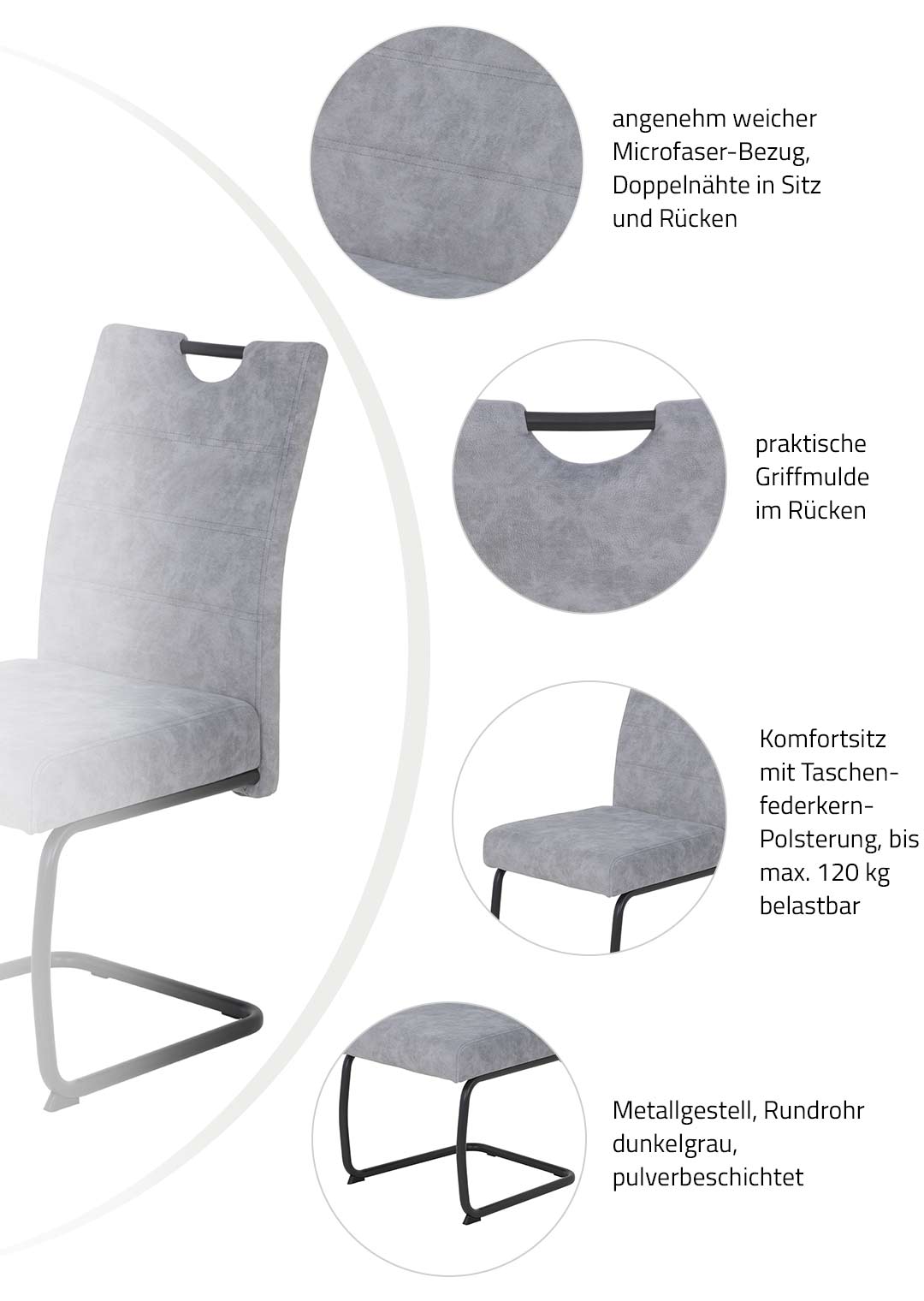 Genießen Sie gemütliche Abende mit unserem Schwingstuhl LAURINA!Unser Schwingstuhl LAURINA in einem modernen grau erscheint als optimale Ergänzung für Ihren Wohn- oder Essbereich. Der Stuhl wurde mit einem Bezug aus Microfaser umhüllt, welcher sich angenehm weich auf der Haut anfühlt. Für eine angesagte Optik dienen sowohl auf der Sitz-, als auch auf der Rückenfläche verarbeitete Doppelnähte. So erhalten Sie mit unserem Schwingstuhl einen echten Blickfang in Ihrem Wohnraum.Als Freischwinger ermöglicht der Stuhl ein leichtes Schwingen, was ein entspanntes Sitzgefühl vermittelt. Das dunkelgraue Metallgestell sorgt dabei für die nötige Stabilität. Zur Unterstützung Ihrer Körperhaltung wurde die Sitzfläche mit einem Taschenfederkern ausgestattet. Dieser bietet zusätzlich einen bequemen Sitzkomfort und lässt Sie und Ihre Gäste gemütlich beisammen sitzen. Durch eine praktische Griffmulde an der Rückenlehne können Sie den Stuhl mit Leichtigkeit verschieben und im Handumdrehen individuell positionieren. Insgesamt ist unser Schwingstuhl LAURINA eine Bereicherung für Ihr Zuhause. Bestellen Sie Ihren neuen Schwingstuhl noch heute online. Wir freuen uns auf Ihren Besuch!Produktdetails: |