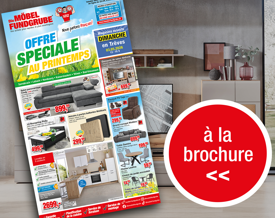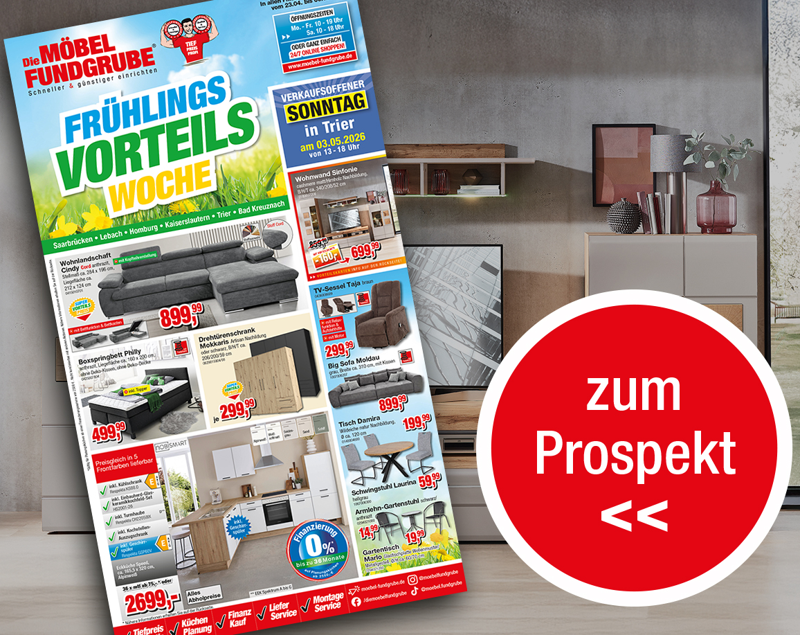 *Die Möbelfundgrube Flex-Finanzierung ist wählbar zwischen 6 bis 72 Monaten. Die Vermittlung des Darlehens erfolgt durch uns nur in unseren Filialen für die TARGOBANK AG, Kasernenstraße 10, 40213 Düsseldorf. Nur mit deutschem Wohnsitz und in Deutschland ansässigem Arbeitgeber möglich. Das Angebot gilt ab 250,00 € Nettodarlehensbetrag und einer Mindestrate von 10,00 € monatlich. Der jeweilige Kaufpreis entspricht dem Nettodarlehensbetrag. Die genannten Sollzinssätze sind gebunden für die gesamte angegebene Laufzeit, effektiver Jahreszins von 0,0 % (Sollzins 0,00%) Laufzeit 6 Monate; von 4,99 % (Sollzins 4,88 %) Laufzeit 7 bis 12 Monate; von 5,99 % (Sollzins 5,84 %) Laufzeit 13 bis 24 Monate; von 6,49 % (Sollzins 6,31 %) Laufzeit 25 bis 36 Monate; von 8,99 % (Sollzins 8,64 %) Laufzeit 37 bis 48 Monate; von 10,99 % (Sollzins 10,48 %) Laufzeit 49 bis 72 Monate. Repräsentatives Beispiel i.S. d. § 6a Abs. 4 PAngV: Gesamtdarlehensbetrag: 1.650,39 €; monatliche Rate: 45,80 €; Laufzeit 36 Monate; Nettodarlehensbetrag 1.500,00 €; Sollzinssatz 6,31 % jährlich, gebunden für die gesamte Laufzeit; effektiver Jahreszins 6,49 %. Die letzte Rate kann abweichen. Bonität vorausgesetzt, Gültig nur bei Neukauf. c) 10 Euro geschenkt bei Newsletteranmeldung: